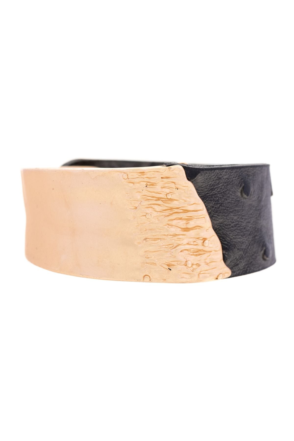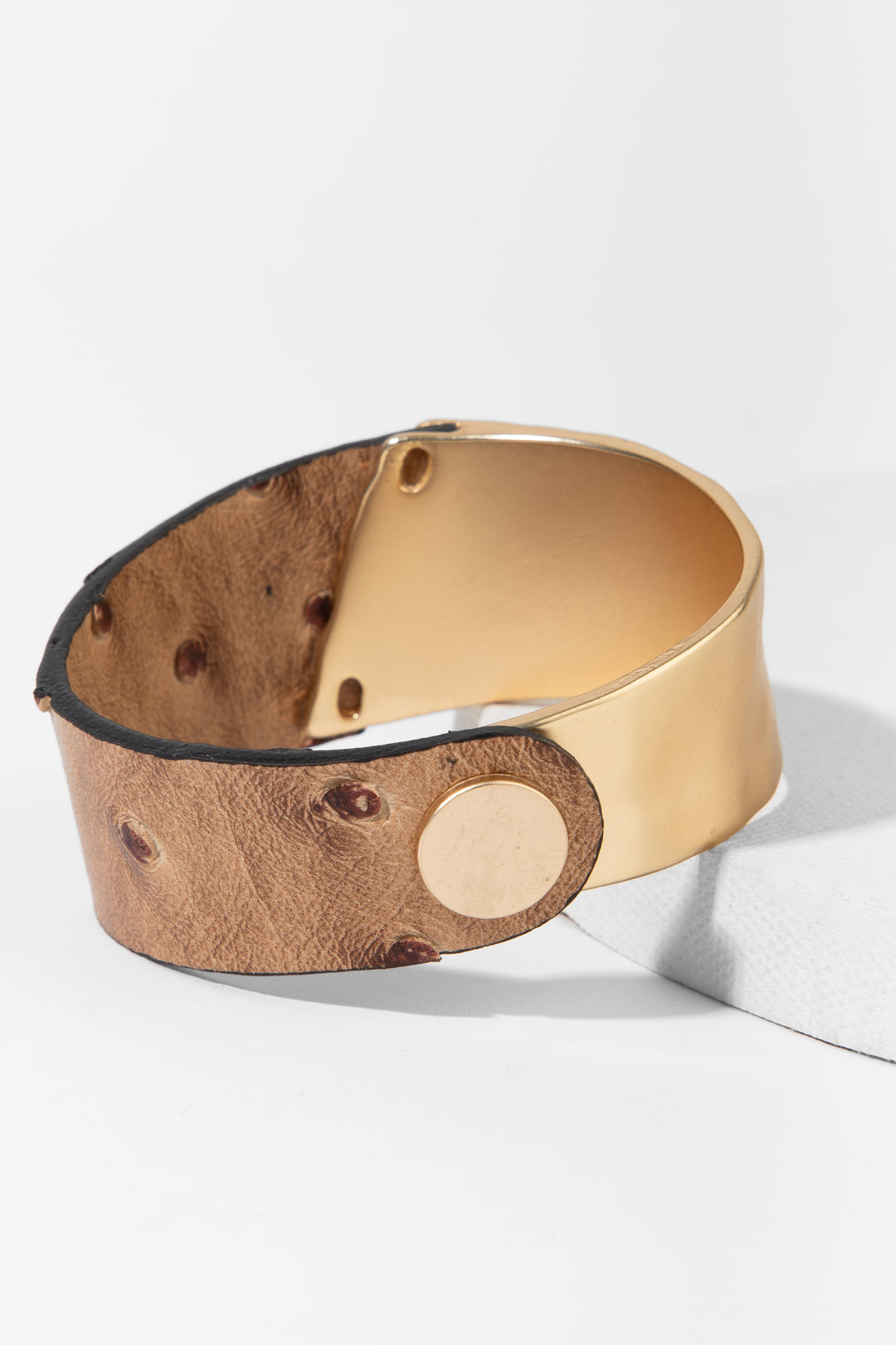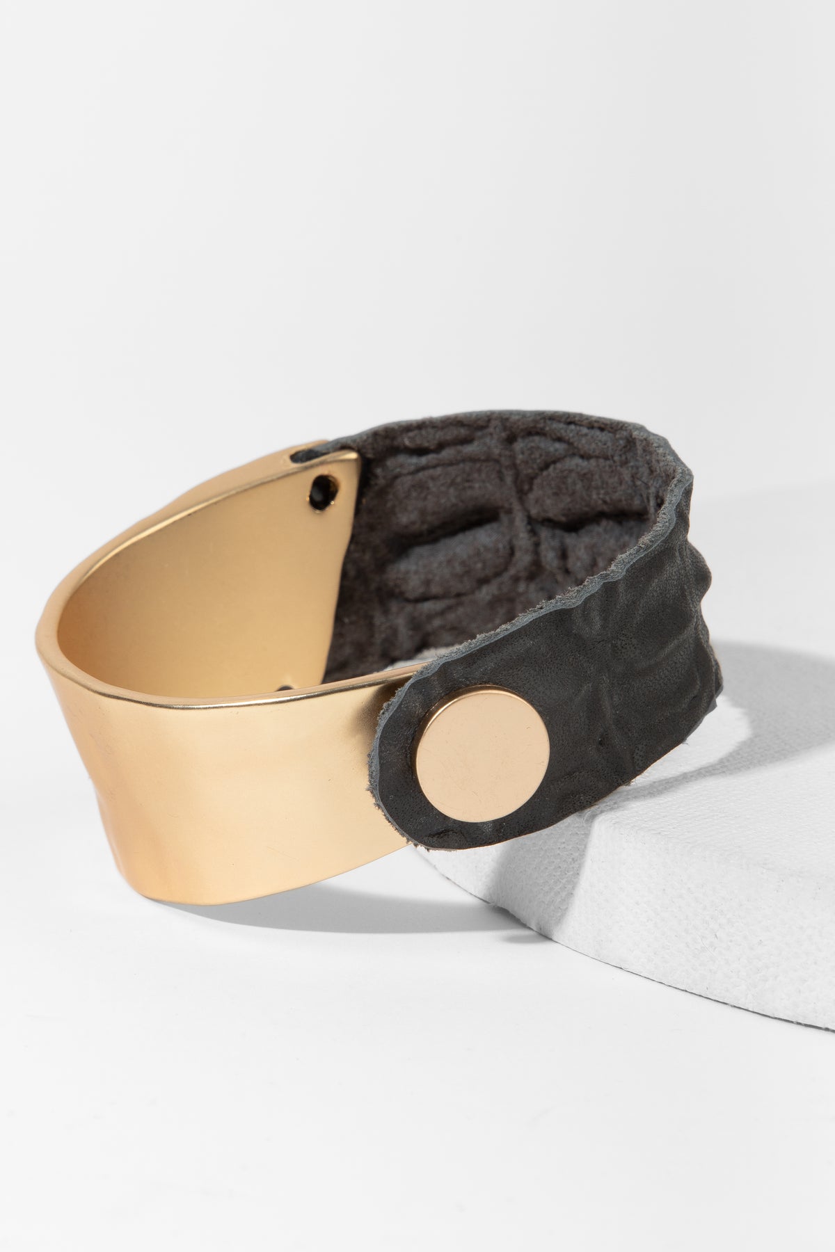 "Take a walk on the wild side with this Wild Ways Leather Bracelet. This piece features a textured soft wide leather strap beautifully embracing a matte gold wavy metal accent halfway through. Add a fashion statement to your everyday styling attire.