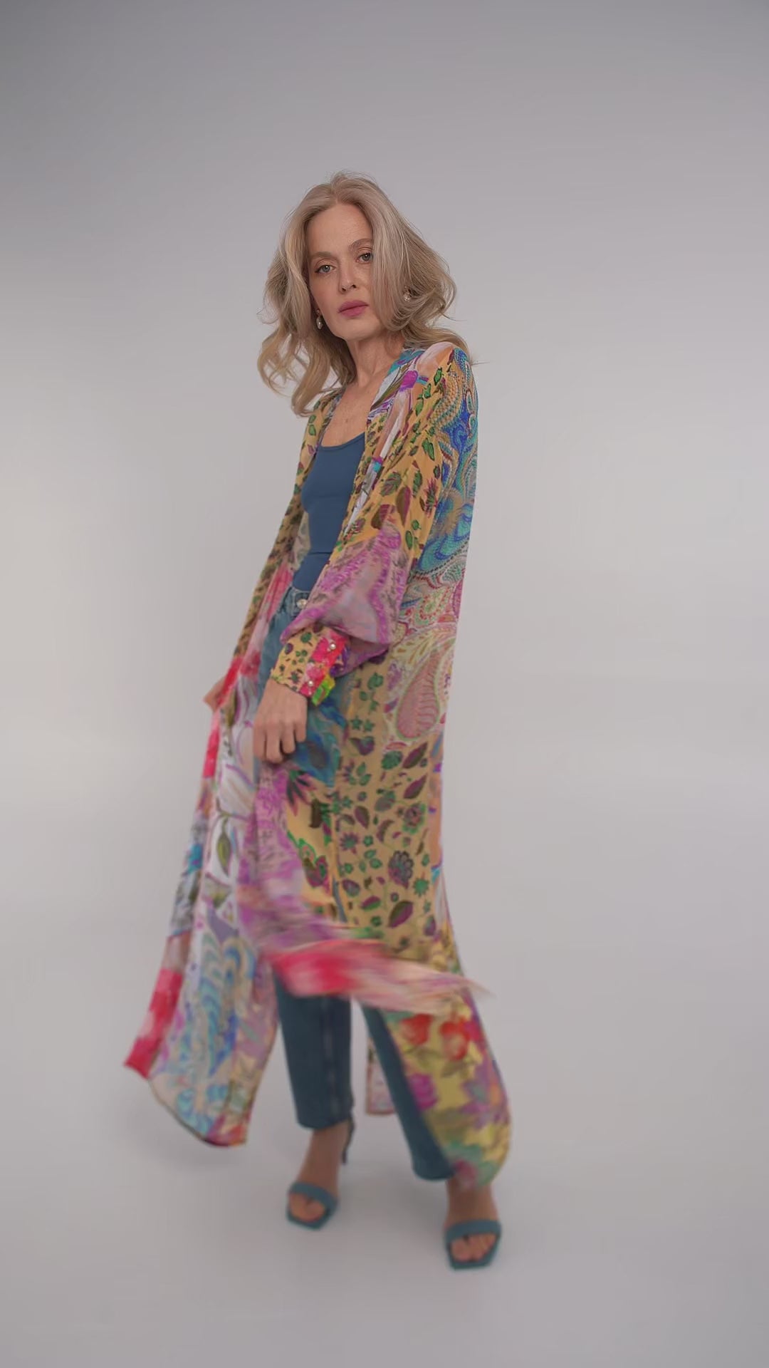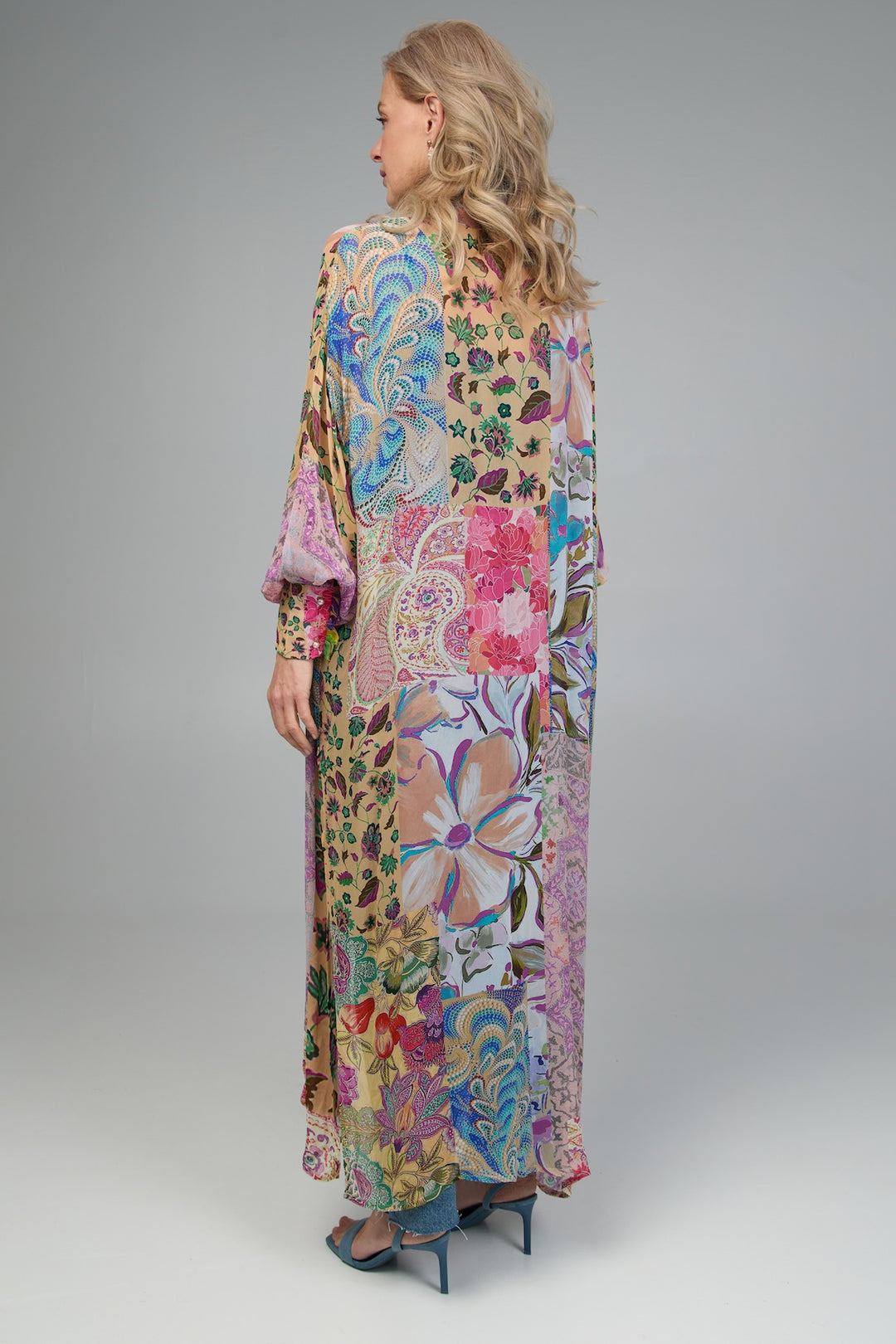 Discover our Floral Patch Long Kimono. Its open-front design allows easy layering over your outfit, draping gracefully, and its lightweight and breathable fabric makes it the perfect choice for any season. Whether lounging at home or stepping out for a casual gathering, our patchwork kimono promises to elevate your style with its fusion of exquisite design and comfort.
