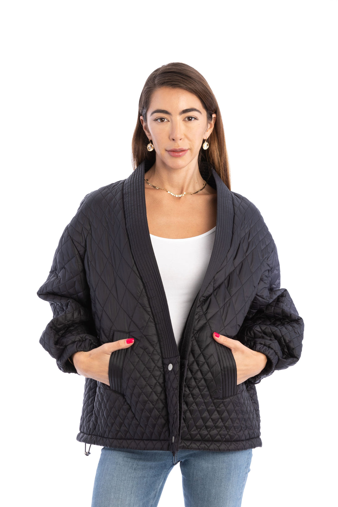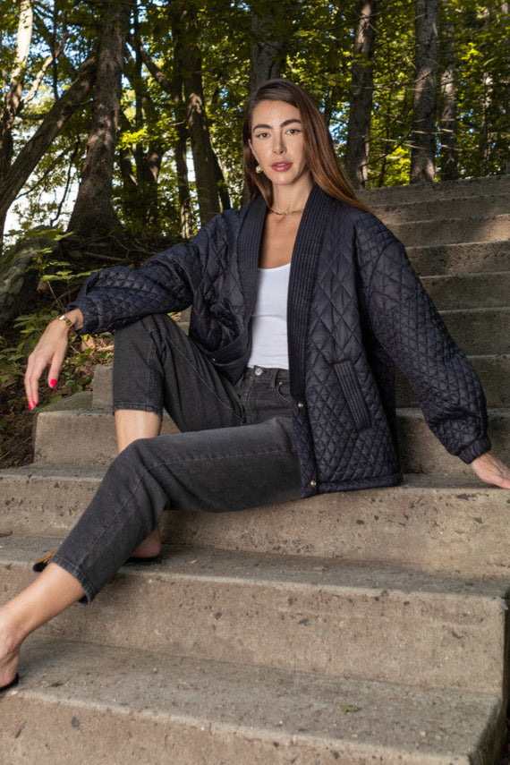 Our Diamond Quilted Jacket displays a diamond quilted pattern that adds a touch of sophistication, giving it a luxurious and refined look. The quilted stitching enhances its aesthetic appeal and provides extra insulation, keeping you warm and cozy during cooler seasons. The puffer jacket, designed with convenience in mind, features two pockets strategically placed for easy access plus efficient storage and has two buttons to secure it partially closed so you can adjust the level of closure according to how much of your outfit you want to showcase. The outerwear is smooth, providing a luxurious feel that will elevate your style while keeping you comfortable and protected when running errands or during casual strolls.