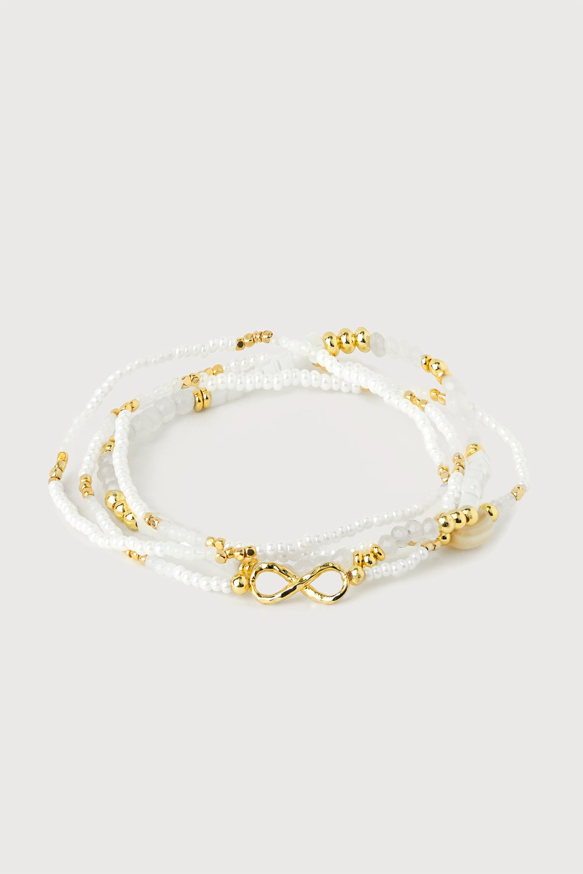 The Infinity Beaded Bracelet Set is a must-have accessory that adds flair to any outfit. It combines four bracelets strung with pretty, colorful golden beads and a unique infinity charm. With four different bracelets, they're easy to wear together or separately.