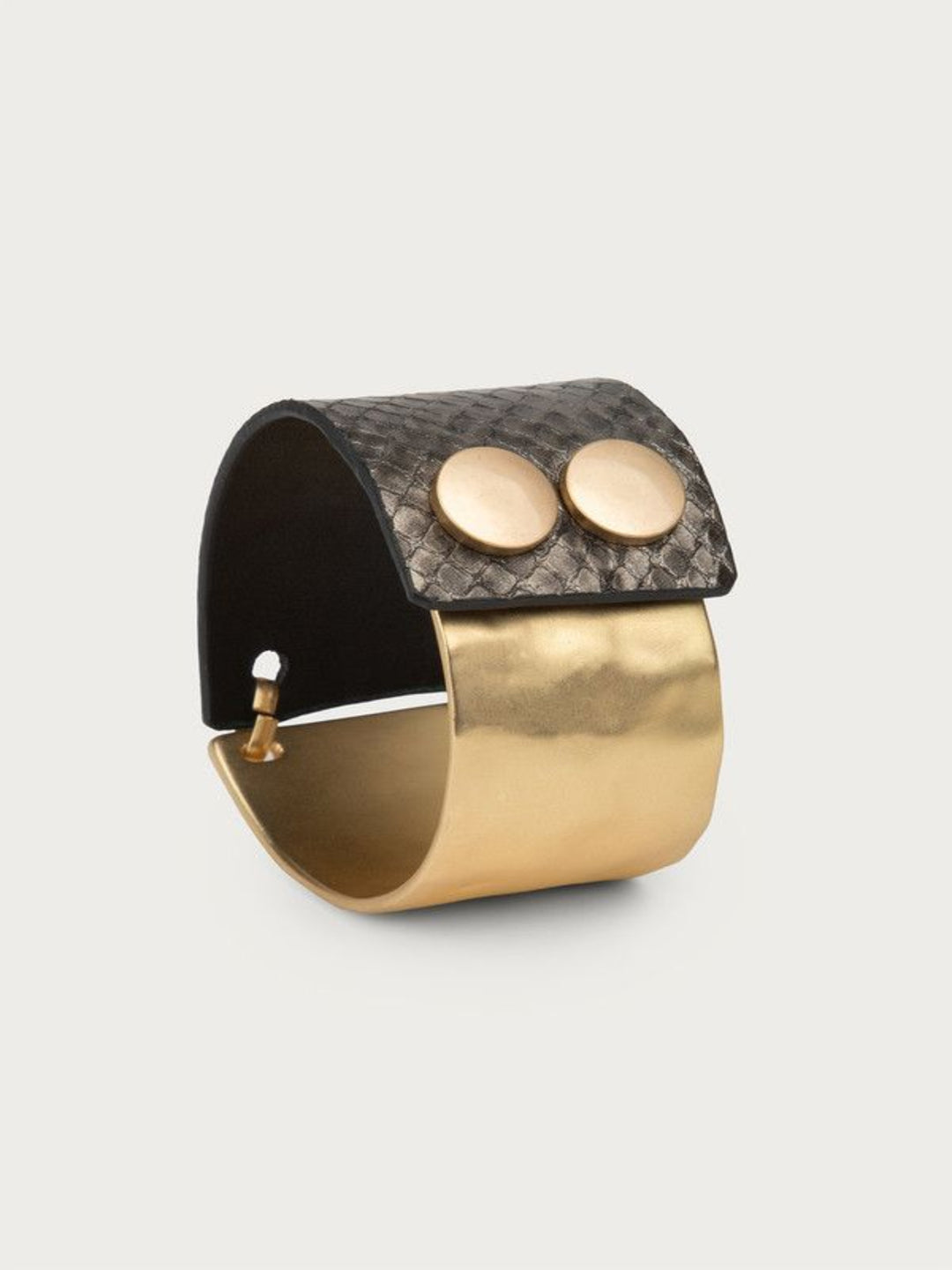 Capture an exotic edge with our Snakeskin Leather Metal Bracelet. This striking bracelet features a wide band of genuine snakeskin leather, showcasing its unique and luxurious texture. A polished metal bar detail adds a modern and contrasting element. The bracelet is finished with a secure double button clasp, ensuring a comfortable and stylish fit. Perfect for adding a touch of daring sophistication to any ensemble.