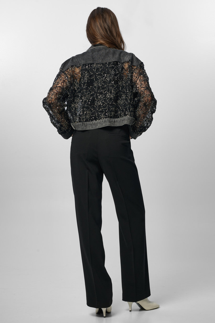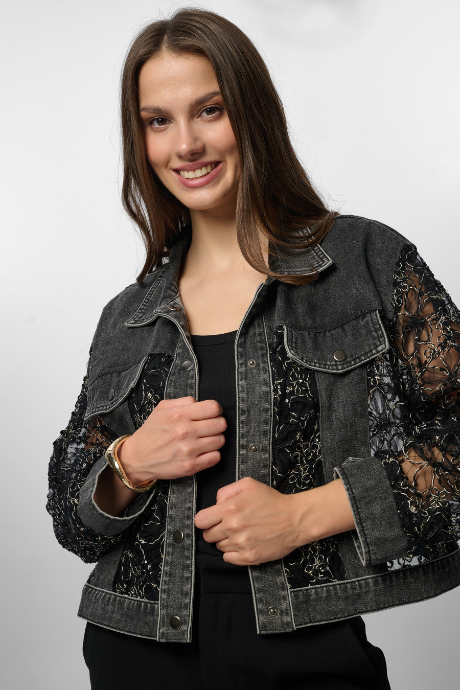 Elevate your fall wardrobe with our Denim Lace Elevate your fall wardrobe with our Denim Lace Jacket. This versatile piece features a classic denim exterior and a delicate floral lace overlay on the front and sleeves, creating a stunning contrast. The full button closure provides ample warmth and styling options. Pair it with a tank and slacks for a casual look, or layer it over a dress for a touch of feminine edge. This jacket is the perfect transitional piece to keep you stylish and comfortable as the seasons change.