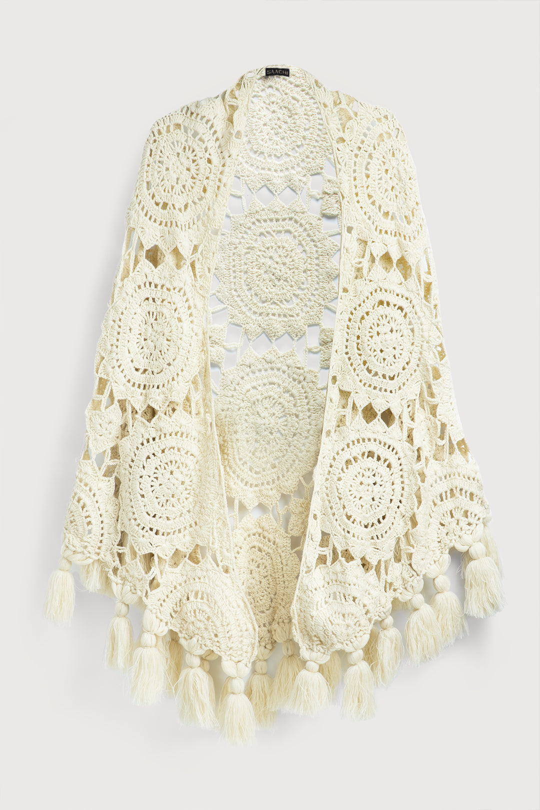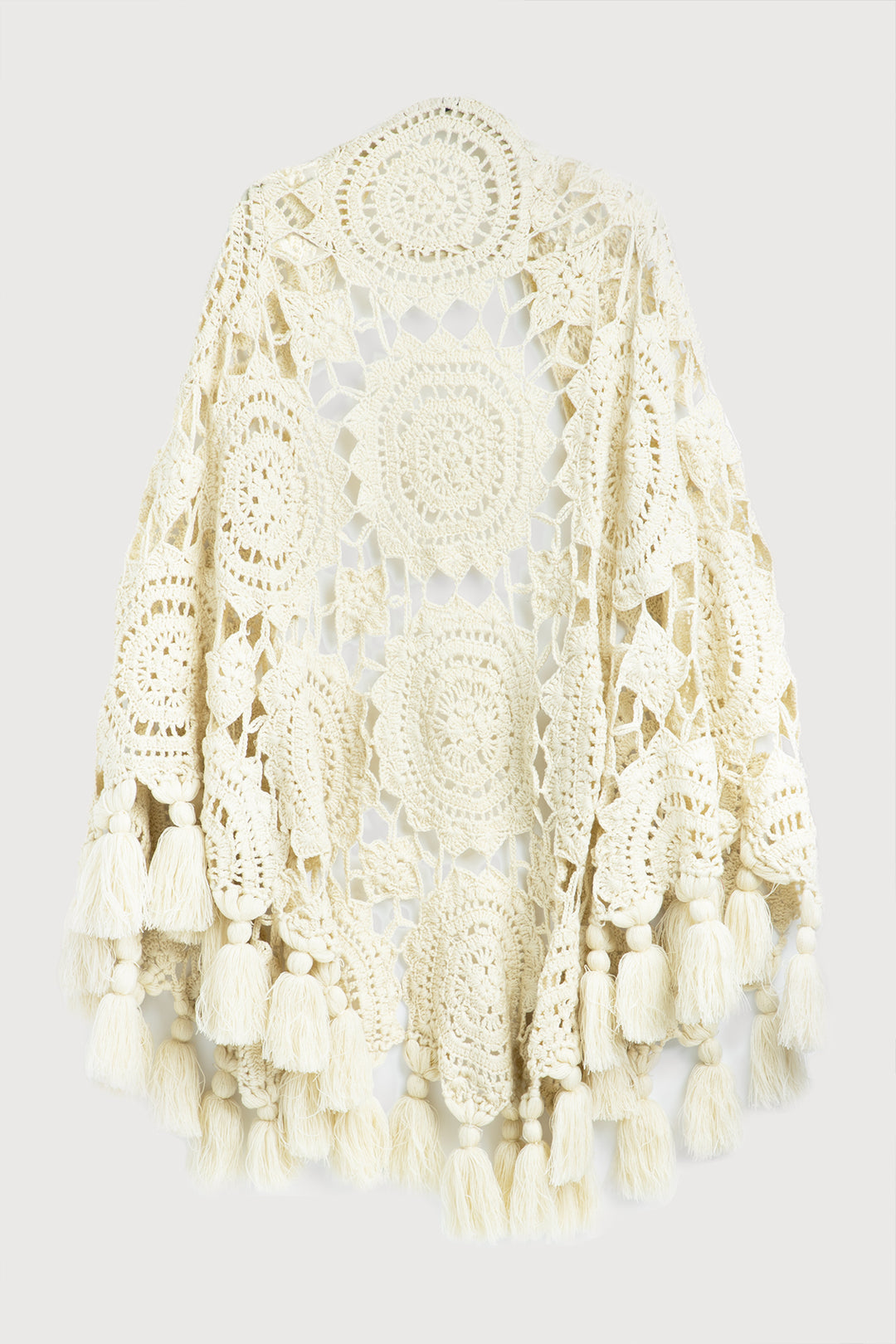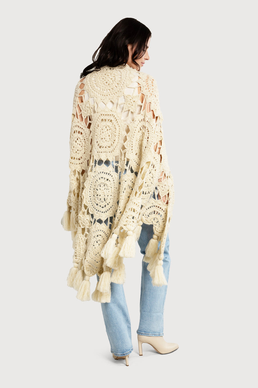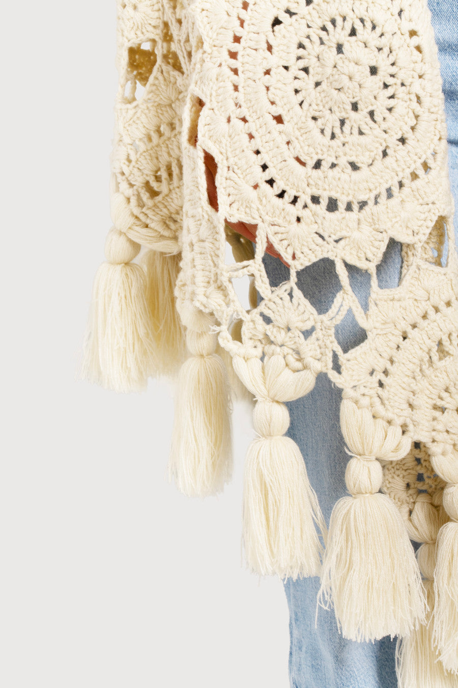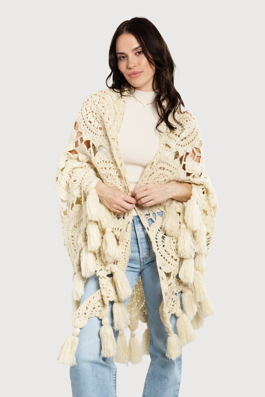 Looking for a stylish accessory that can keep you cozy on chilly days? Look no further than our Crocheted Sunshine Shawl! This beautiful shawl, made with comfortable materials, displays a stunning crocheted sun design, adding a touch of warmth and sunshine to any outfit. With its intricate crochet pattern and large tassels at the bottom, this shawl is truly unique and stands out from other accessories in your collection. Plus, it's versatile enough to wear to any occasion, whether running errands, attending a party, or simply lounging at home. Don't miss out on adding this must-have piece to your wardrobe!