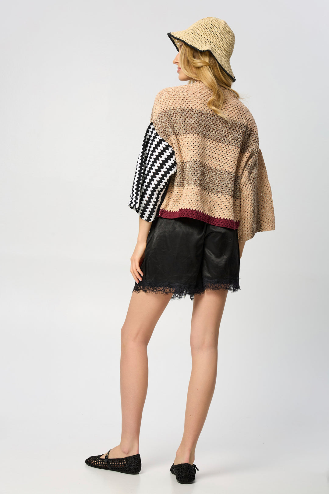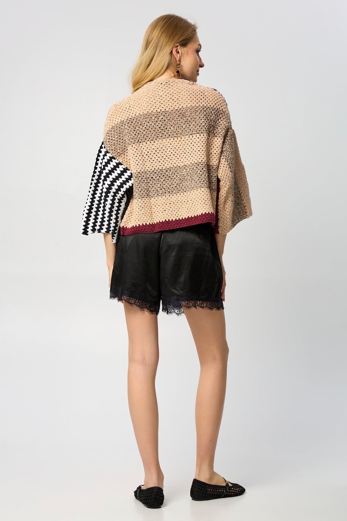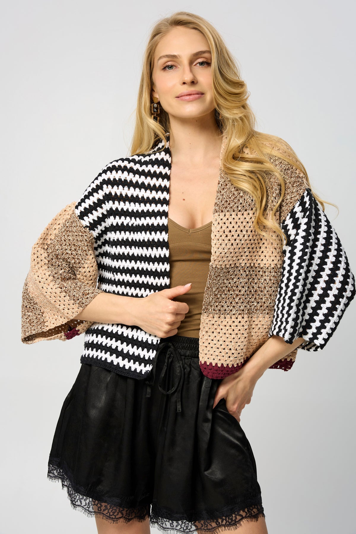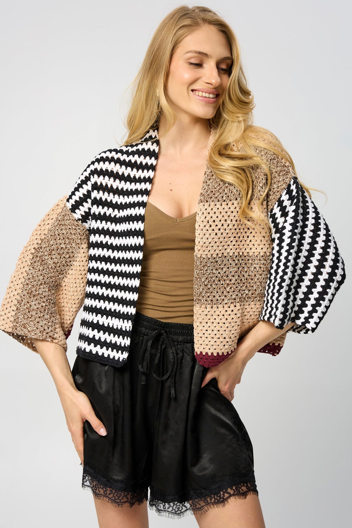 Our Crochet Granny Square Pattern jacket uniquely juxtaposes black and white zig-zags crocheted between pink and tan stripes. With an open weave and open front style, this cotton cardigan leaves you feeling stylish and comfortable. This crocheted jacket is the perfect layering option for the season.