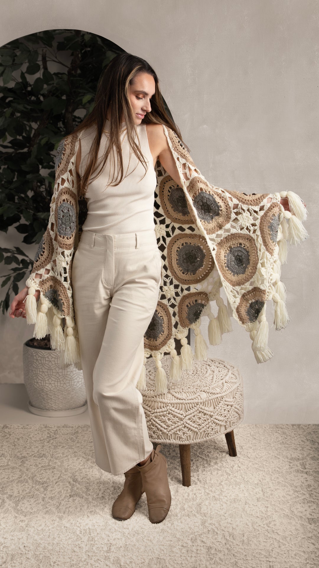 Looking for a stylish accessory that can keep you cozy on chilly days? Look no further than our Crocheted Sunshine Shawl! This beautiful shawl, made with comfortable materials, displays a stunning crocheted sun design, adding a touch of warmth and sunshine to any outfit. With its intricate crochet pattern and large tassels at the bottom, this shawl is truly unique and stands out from other accessories in your collection. Plus, it's versatile enough to wear to any occasion, whether running errands, attending a party, or simply lounging at home. Don't miss out on adding this must-have piece to your wardrobe!