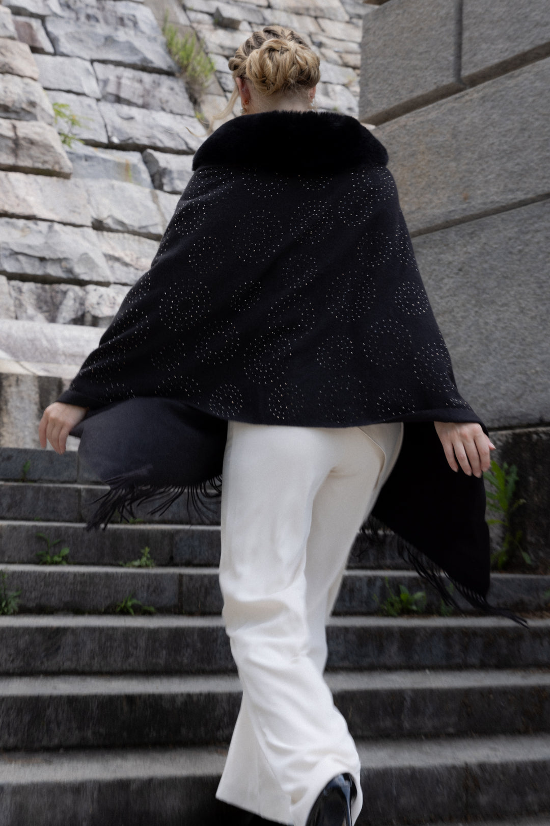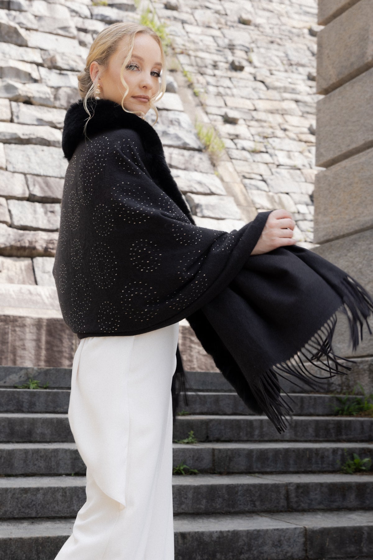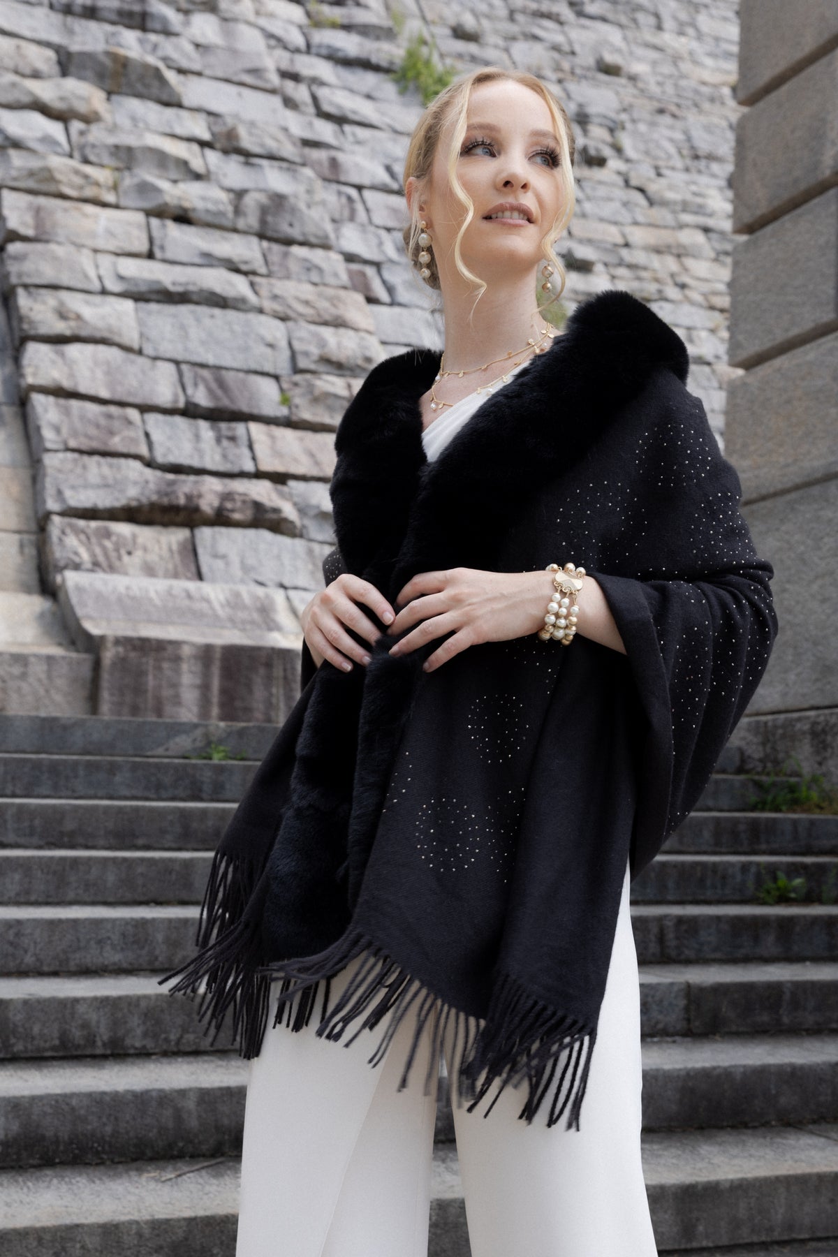 Elevate your holiday look with our shimmering Faux Fur Crystal Scarf. Crystal embellishments in a rippling design add festive sparkle, while the soft fur and versatile drape keep you cozy and stylish. Drape this fur scarf over a dress, a work outfit, or a casual, comfy outfit.