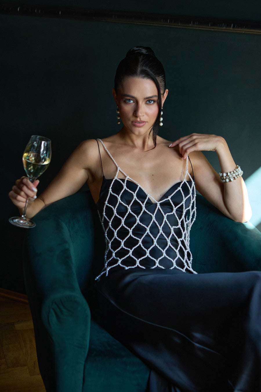 Elevate any outfit with our Pearl Beaded Chain Top. This statement piece features a delicate diamond pattern of pearls cascading into a fringe detail. Layer it over dresses for weddings, elevate workwear, or add a touch of luxury to any top. It's the versatile layering essential your wardrobe craves.