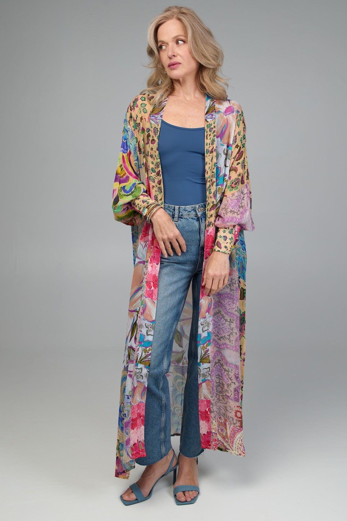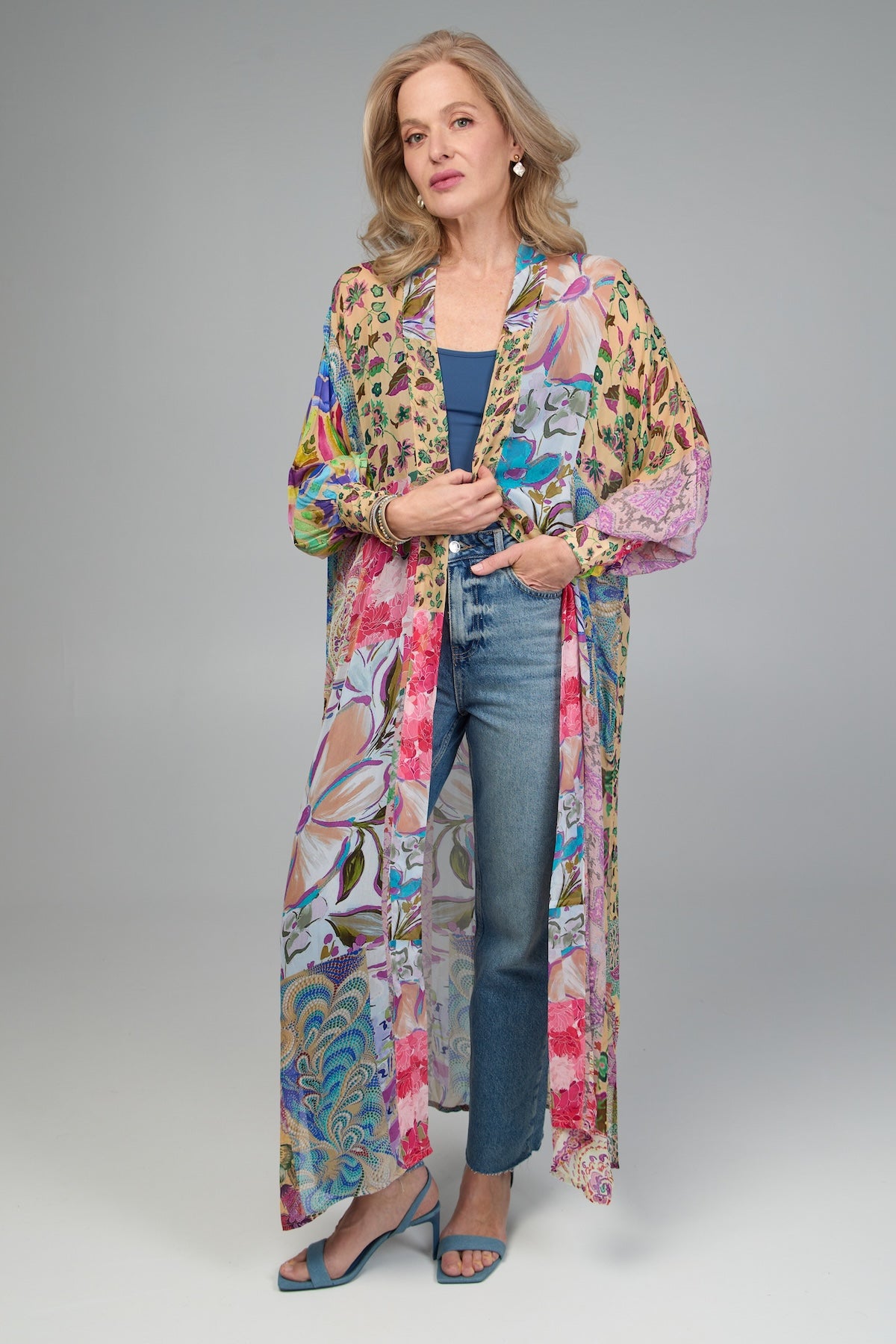 Discover our Floral Patch Long Kimono. Its open-front design allows easy layering over your outfit, draping gracefully, and its lightweight and breathable fabric makes it the perfect choice for any season. Whether lounging at home or stepping out for a casual gathering, our patchwork kimono promises to elevate your style with its fusion of exquisite design and comfort.