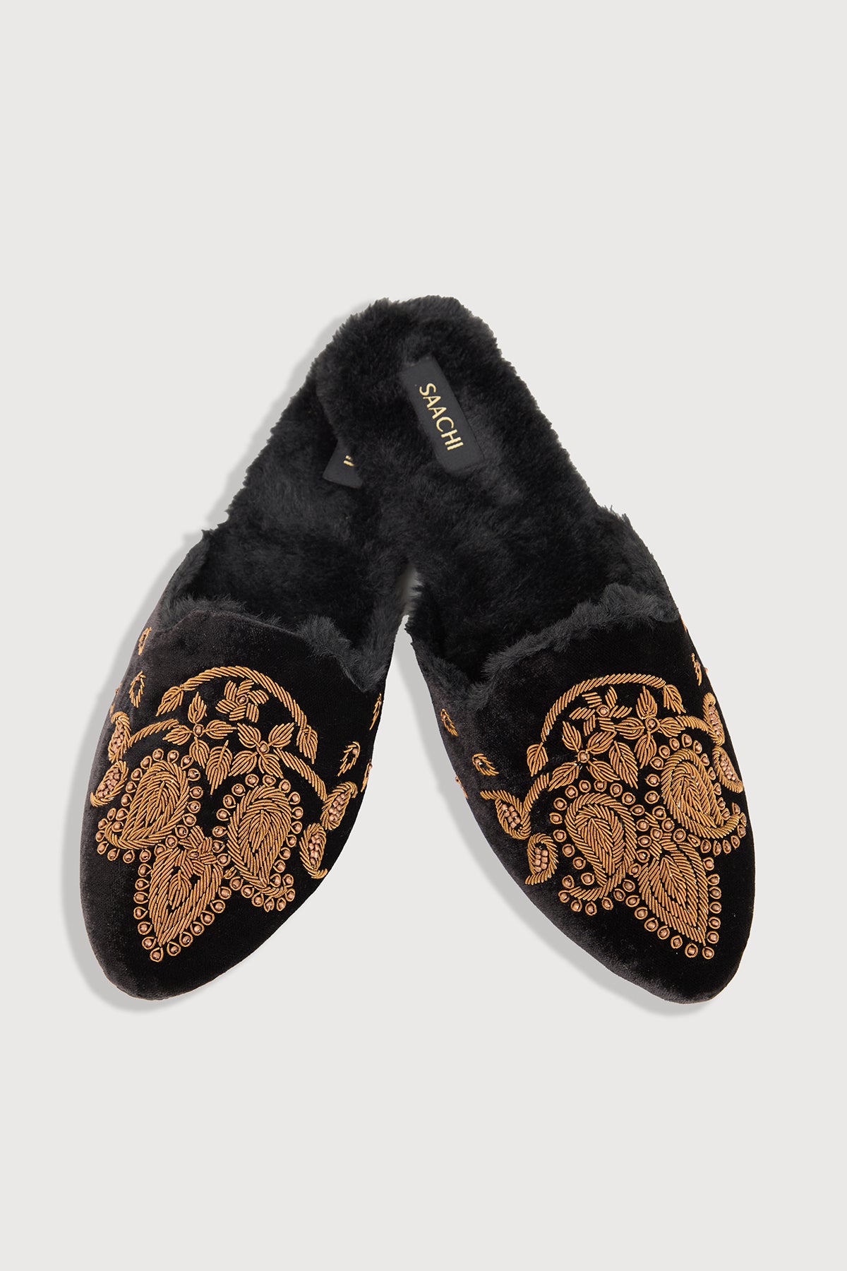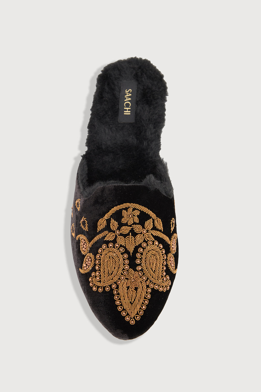 Step into luxury with our Golden Paisley Fur Mules, a stunning fusion of comfort and ornate style. These exquisite mules feature a black velvet exterior, richly embroidered with an intricate antique gold paisley motif for a regal, textured look. The inside is lined with plush, soft fur, offering a cozy and comfortable fit. Perfect for making a statement, these shoes blend the opulence of anti-gold embroidery with a modern mule silhouette, making them an ideal choice for both special occasions and elevated everyday wear.