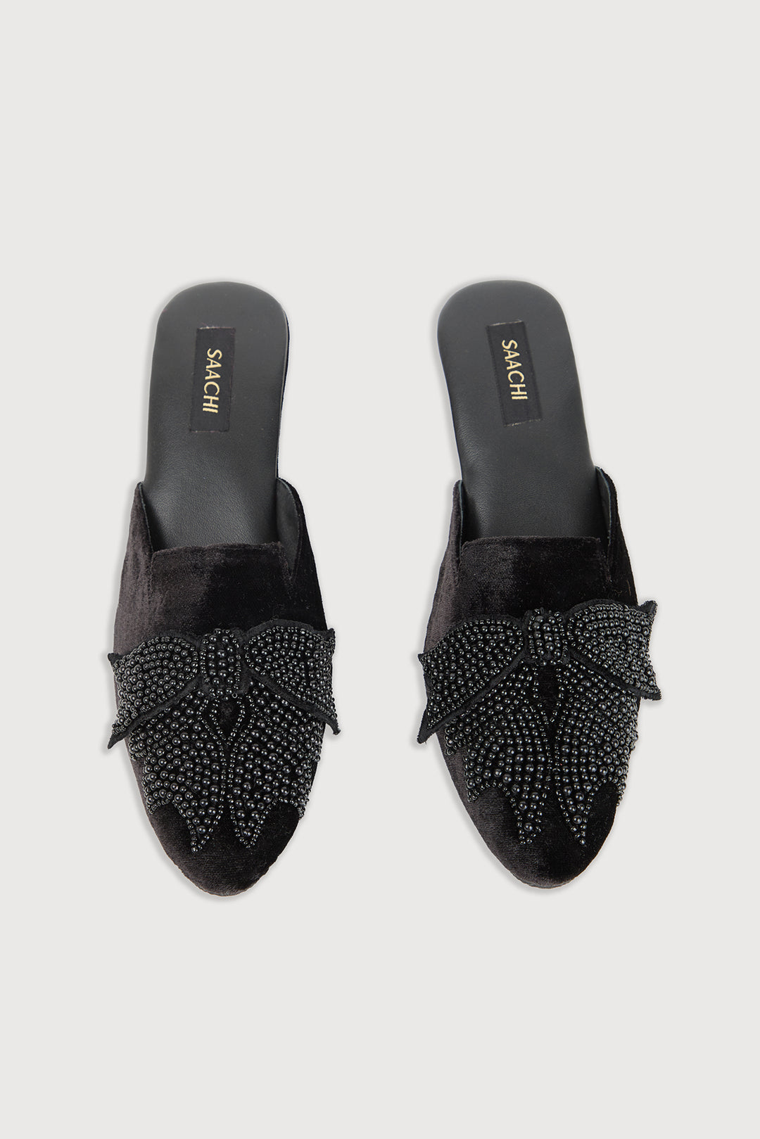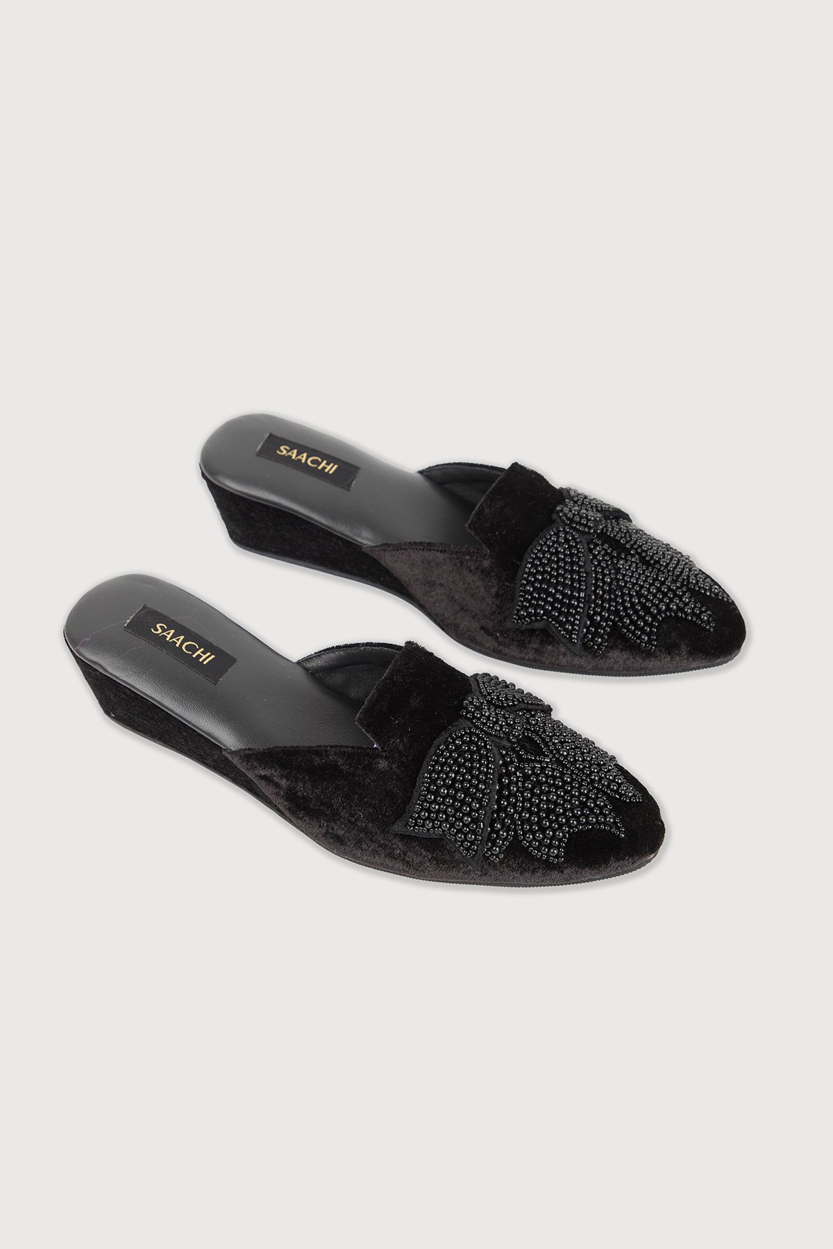 Step into classic elegance with our Velvet Bow Mules. These luxurious slip-on shoes are crafted from a rich black velvet, giving them a soft and refined feel. The focal point is a beautiful, three-dimensional statement bow, intricately crafted from black beads for a unique, textured design. A comfortable low wedge heel provides subtle lift, making these mules the perfect choice for adding a touch of sophisticated glamour to your evening wear or a special occasion.