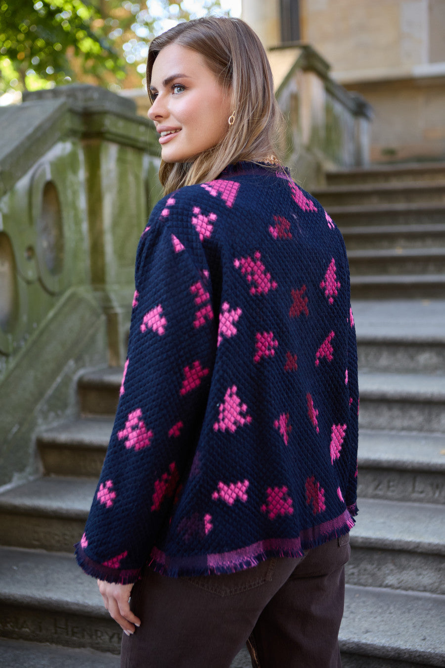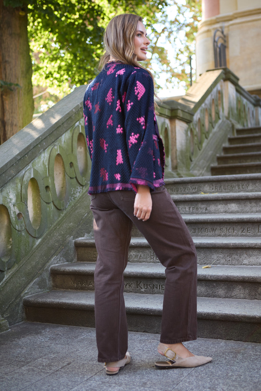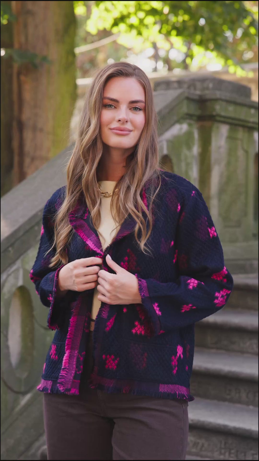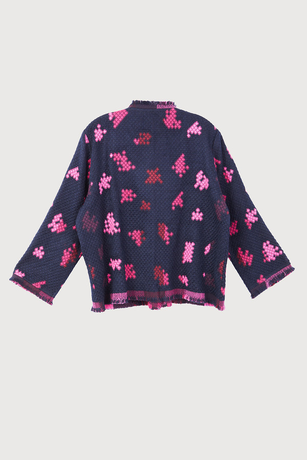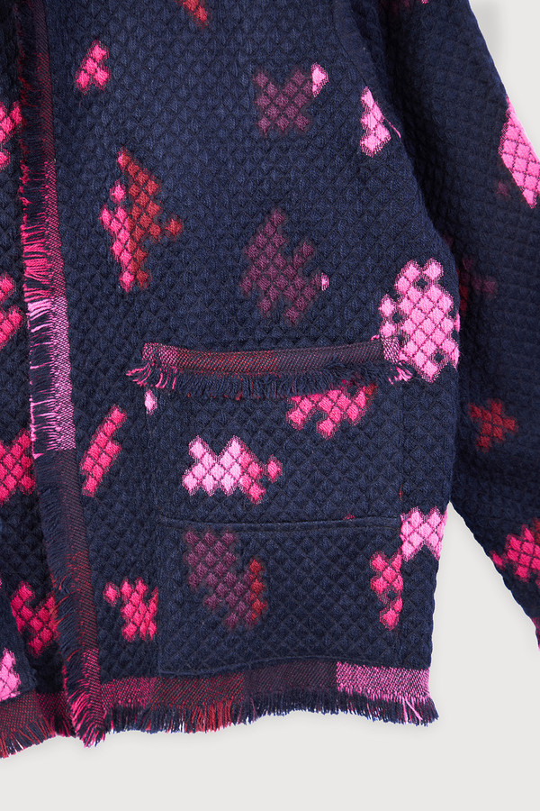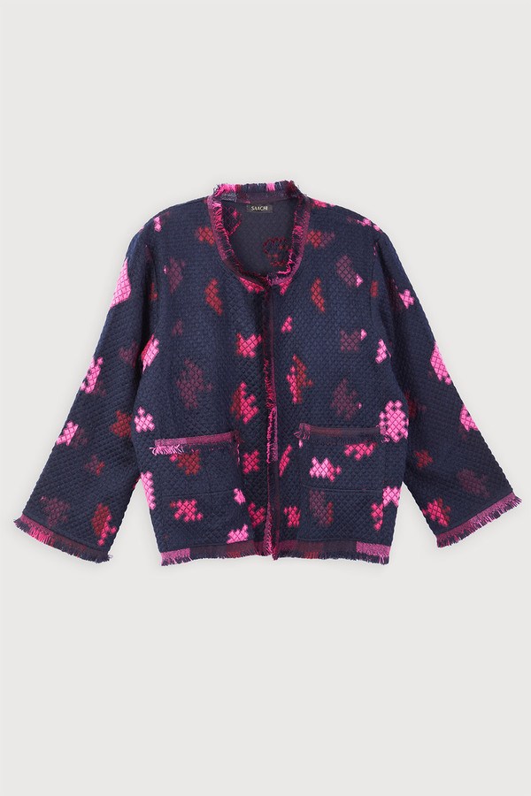 Make a statement with our Abstract Bloom Short Jacket, a captivating piece designed for modern sophistication and comfort. Crafted from a lush cotton and wool blend, this exquisite jacket features an intriguing abstract bloom pattern with playful fringe details, creating a distinctive and artistic look. Perfect for adding a unique pop of personality, it effortlessly complements both casual daytime outfits and chic evening ensembles.