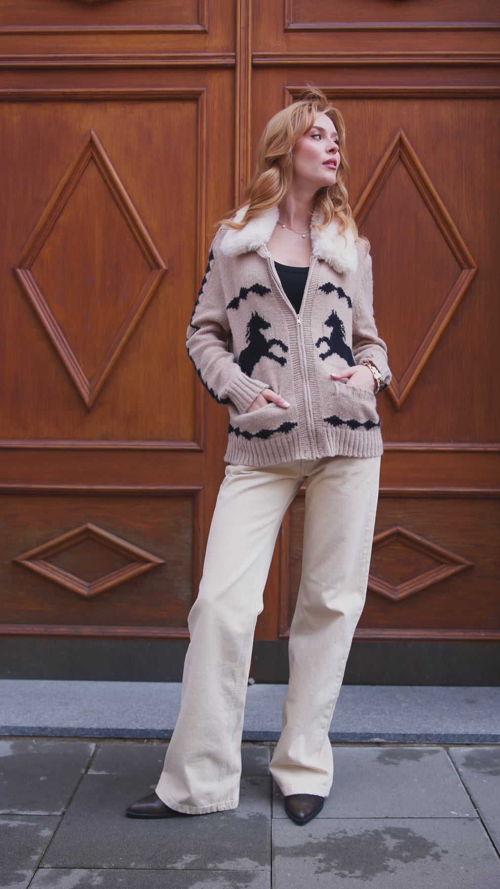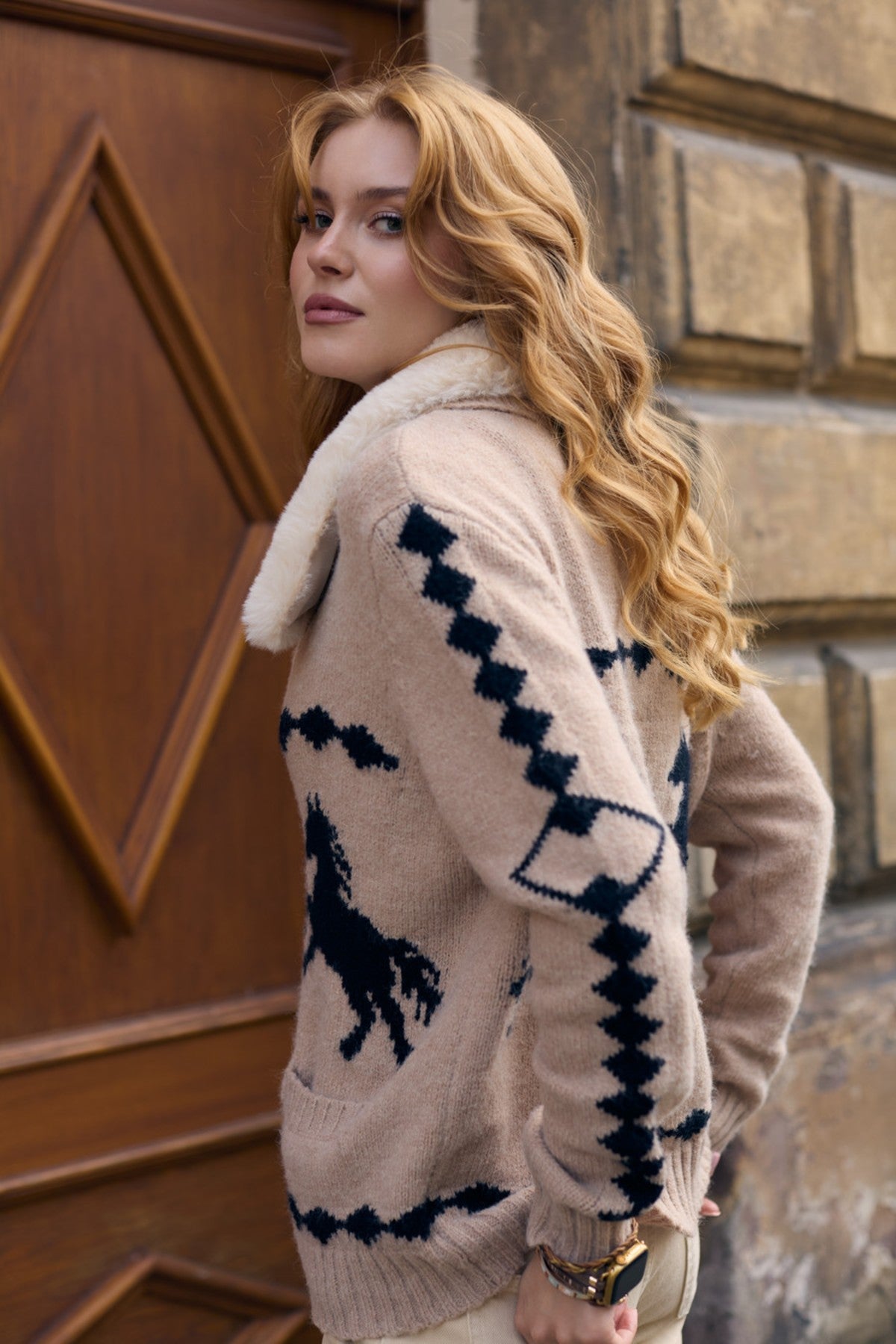 This eye-catching Fur Collar Knit Printed Jacket is the perfect blend of western chic and cozy comfort. Crafted from a soft, inviting knit, this zip-up jacket features a plush faux fur collar that provides warmth and a touch of elegance, complemented by striking horse print motifs and geometric detailing on the sleeves. Ideal for adding a unique, playful touch to your casual outfits, it's perfect for both a cozy night in or a stylish day out.
