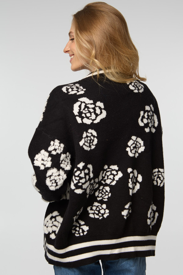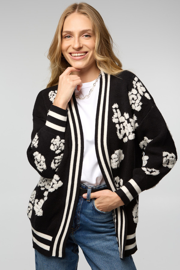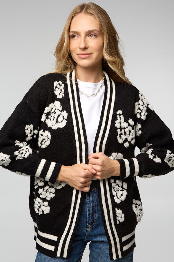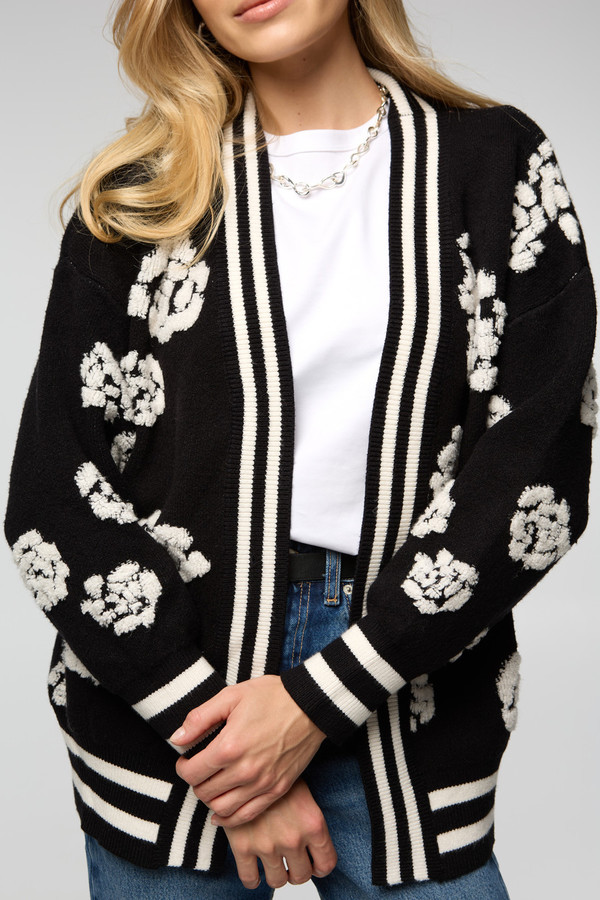 Elevate your style with our Midnight Floral Cardigan, a delightful piece perfect for adding unique personality to your wardrobe. This exquisite cardigan features an eye-catching white floral pattern against a dark knit, with classic striped ribbed trim on the collar, cuffs, and hem, defining its chic silhouette. Perfect for adding a vibrant touch, it effortlessly complements jeans, skirts, or dresses for a stylish and comfortable look.