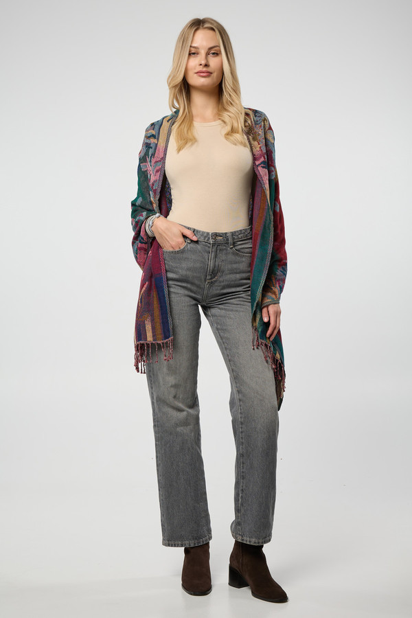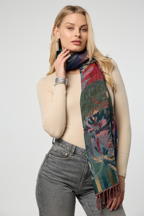 The Rosy Reversible Scarf is a sophisticated layering piece featuring a rich, abstract floral print in deep rosy and plum tones. The long, rectangular design and finely woven texture ensure a luxurious feel and a versatile look that can be worn two ways. Drape this scarf over a neutral cashmere sweater and pair it with black leather pants to allow the scarf's vivid, artistic colors to make a dramatic statement.