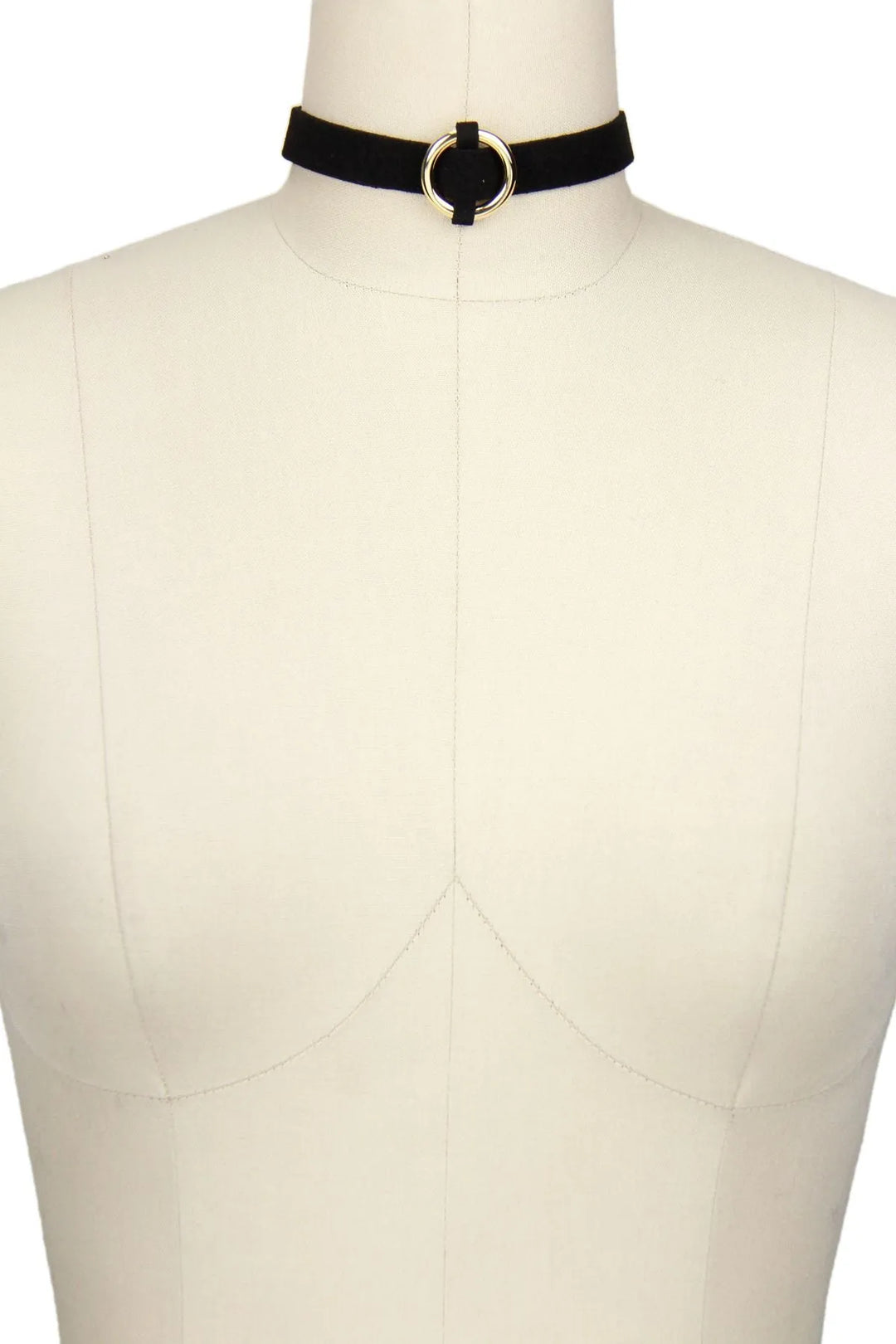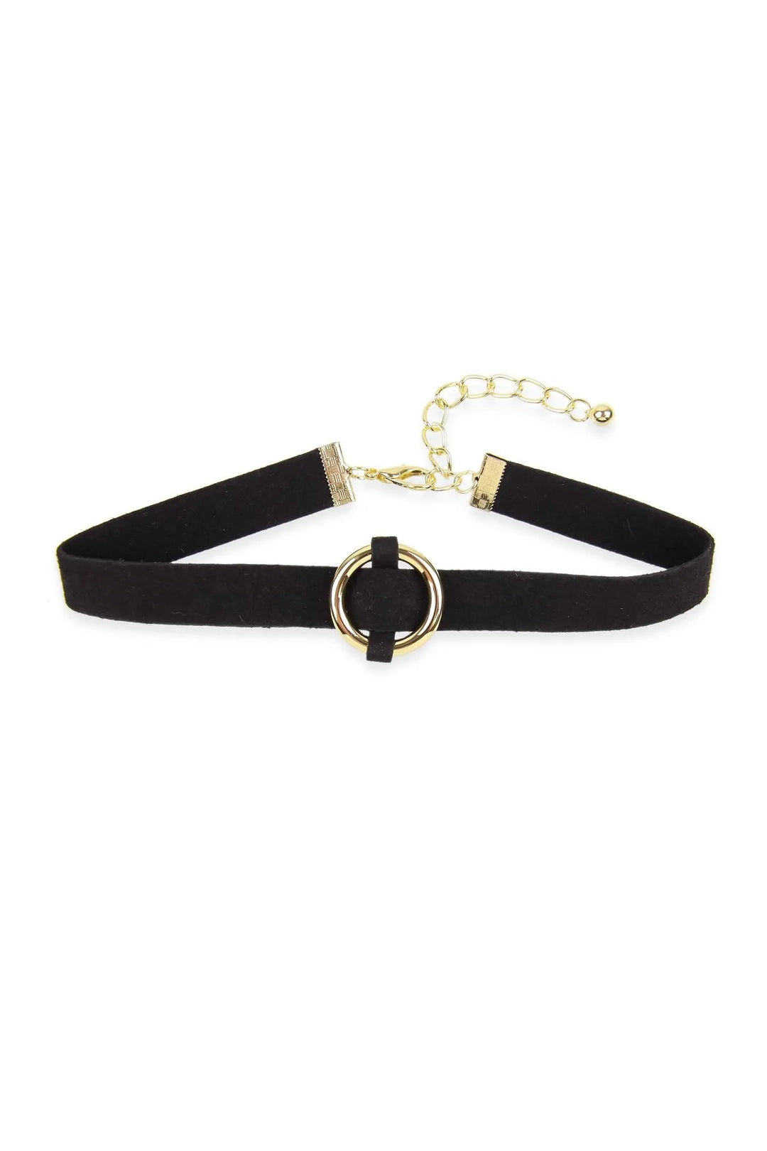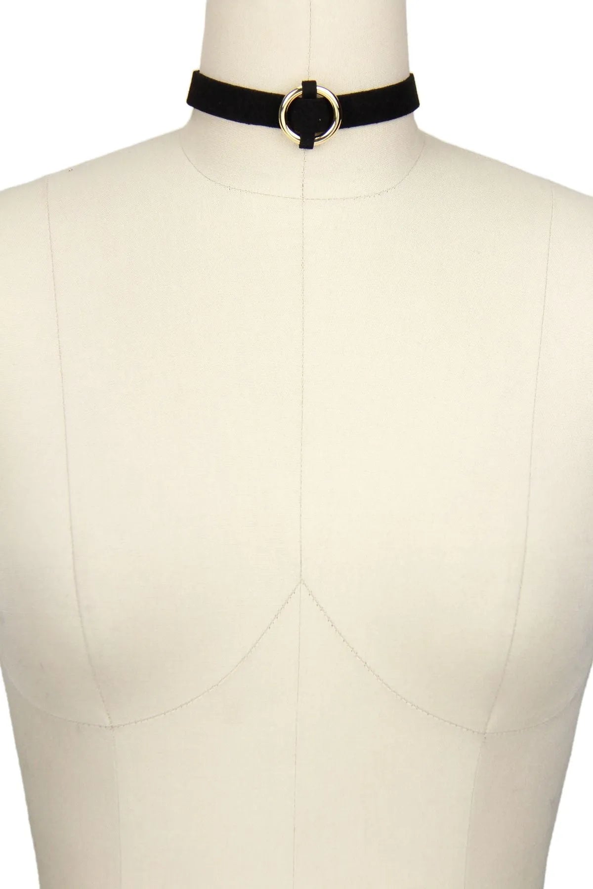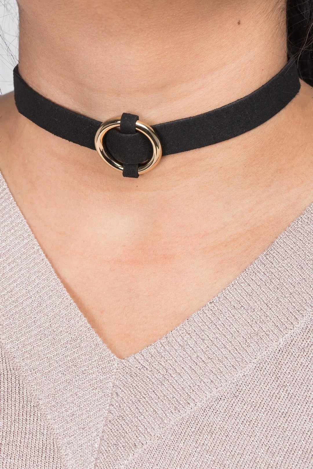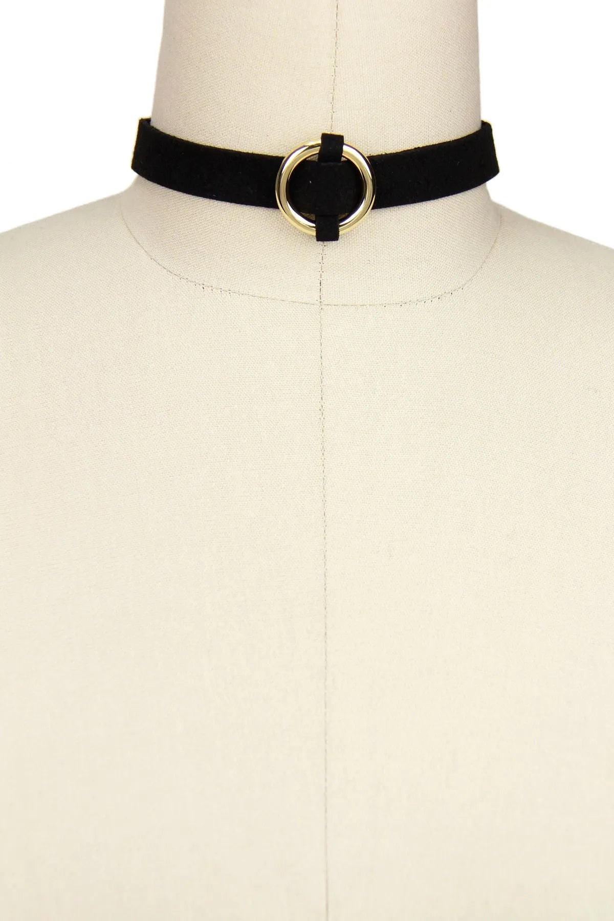 Our Ring Choker necklace is the kind of necklace you'll always have in your jewelry bow, whether your running to work or to an event, it's great for any occasion. A thick strand in a rich shade of black wraps around your neck in a choker design holding a shiny gold ring in its center, sure to have you feel sophisticated as well as stylish!