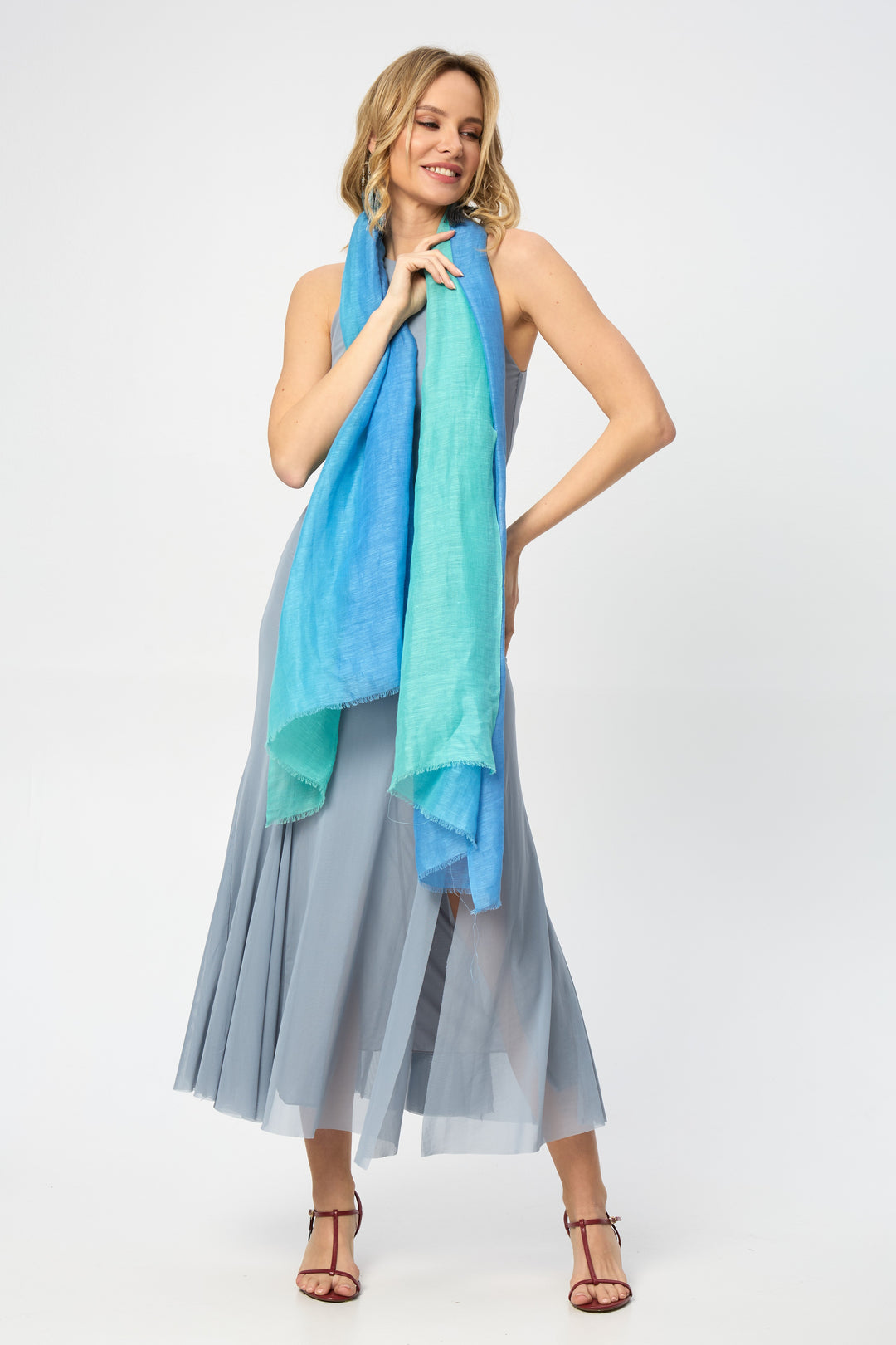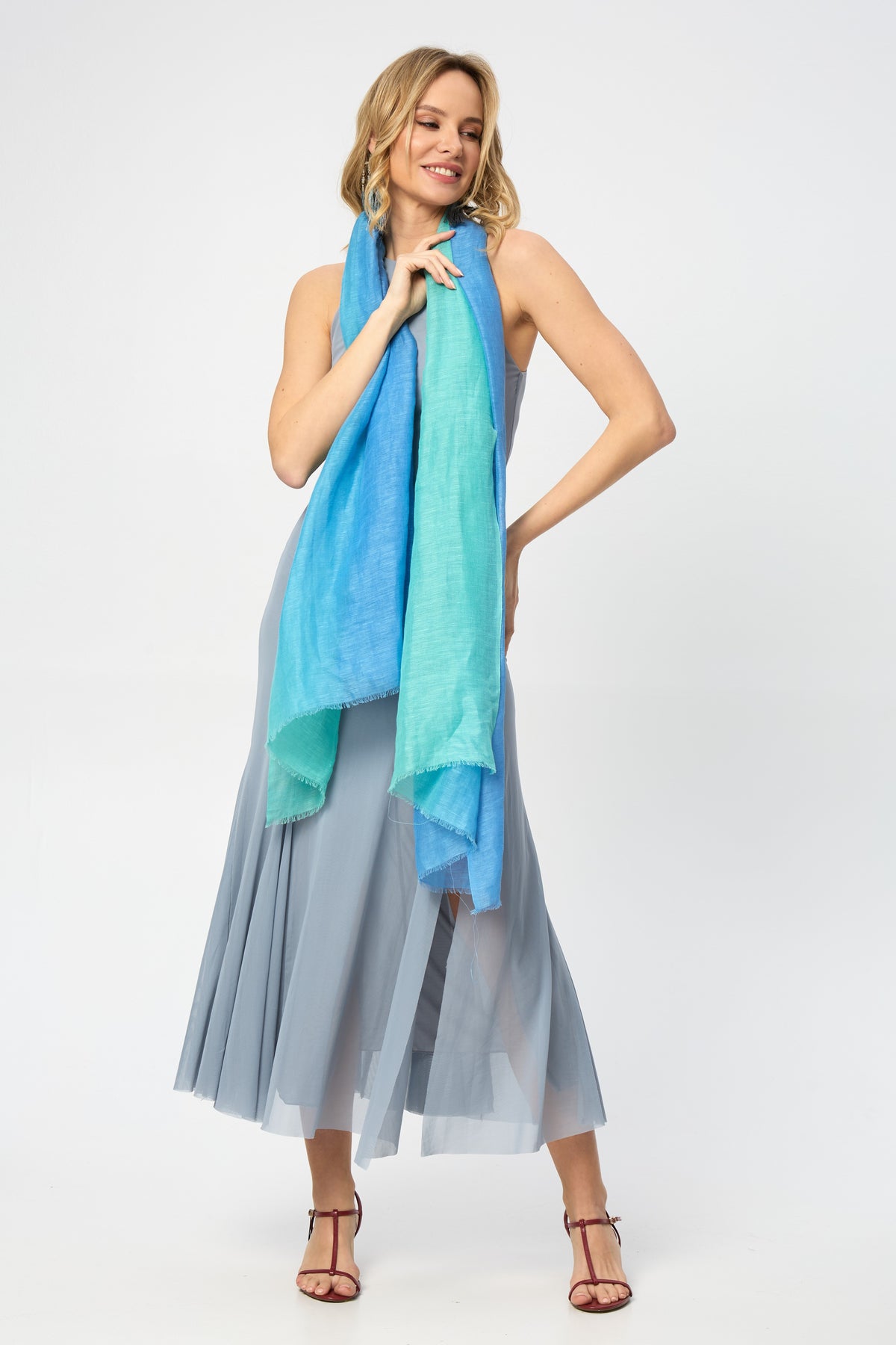 Our Linen Ombré Scarf is a versatile and chic accessory, perfect for spring. Its breathable linen fabric features a delicate eyelash fringe and a stunning ombré design in various color palettes to suit your style. Wear it around your neck, drape it over a sundress, or use it as a vibrant beach cover-up for effortless elegance.