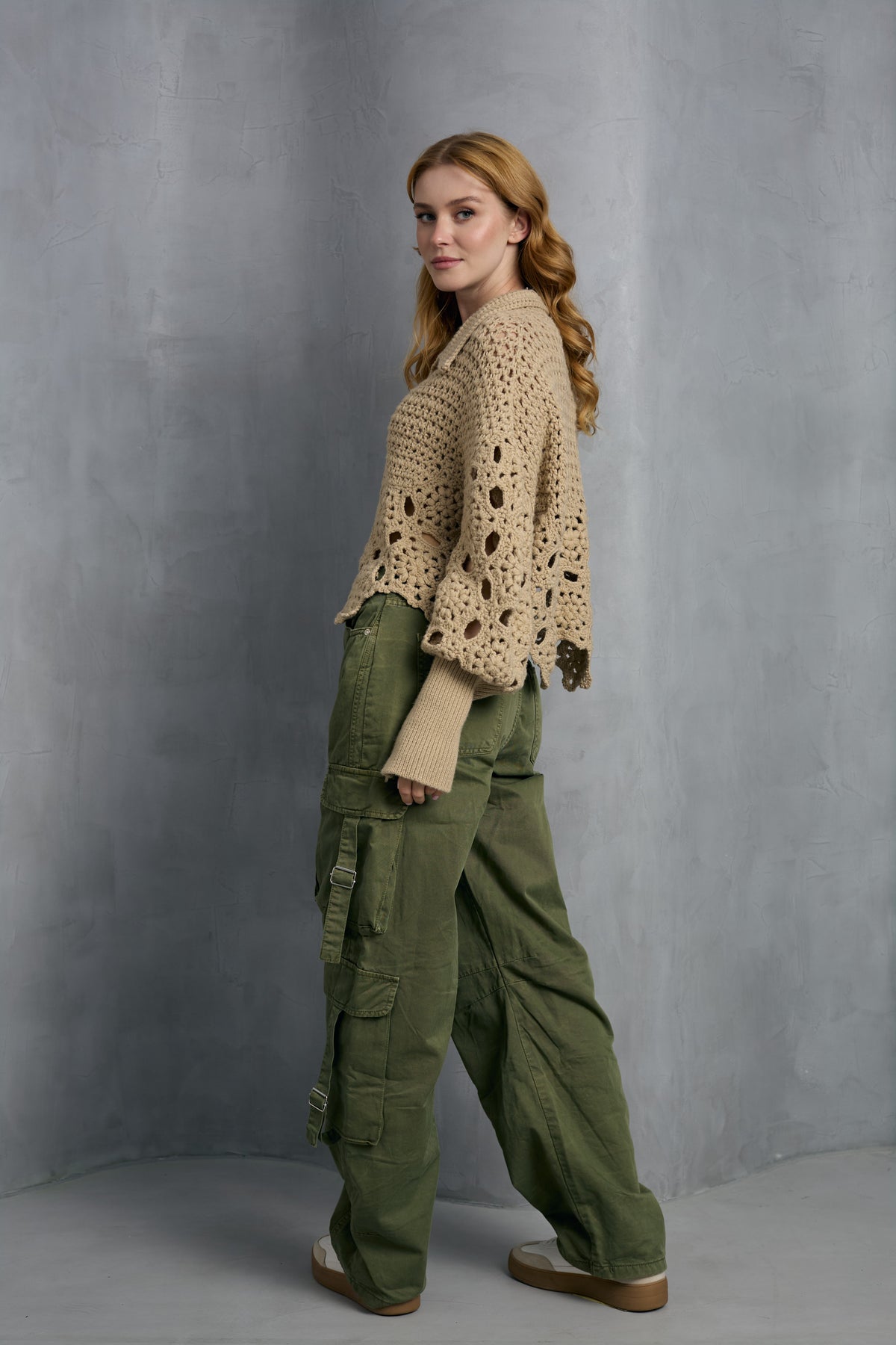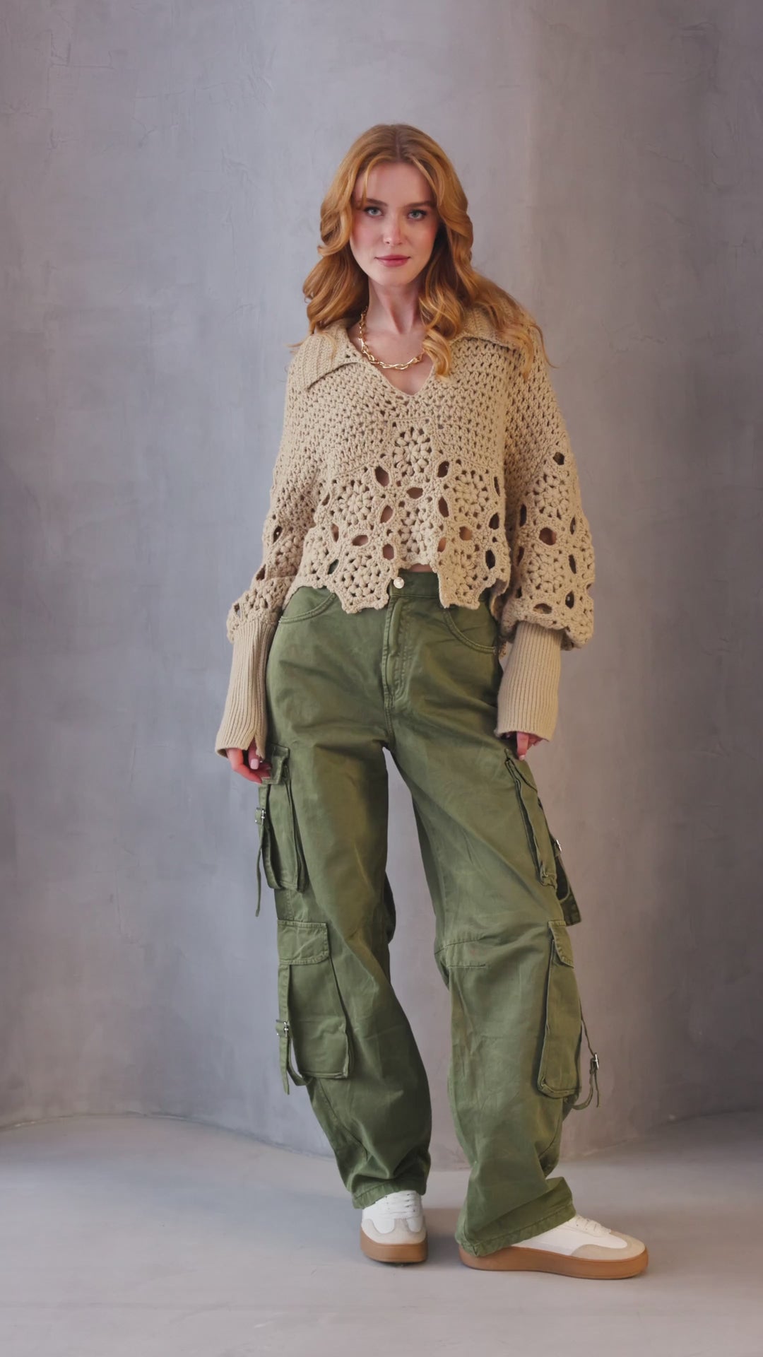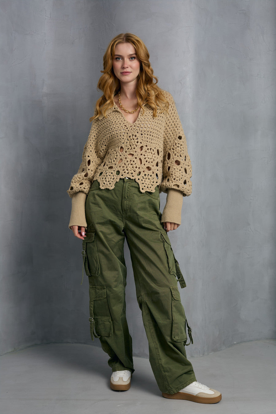 Introducing our Crochet Collared Pullover Sweater. Crafted with breathable crochet fabric, it features a unique hidden floral design and mixed geometric patterns, adding flair to its v-neck silhouette. With its crocheted collar and adaptable style, this sweater is perfect for layering over a camisole, pairing with jeans, or adding a touch of elegance to your work attire.