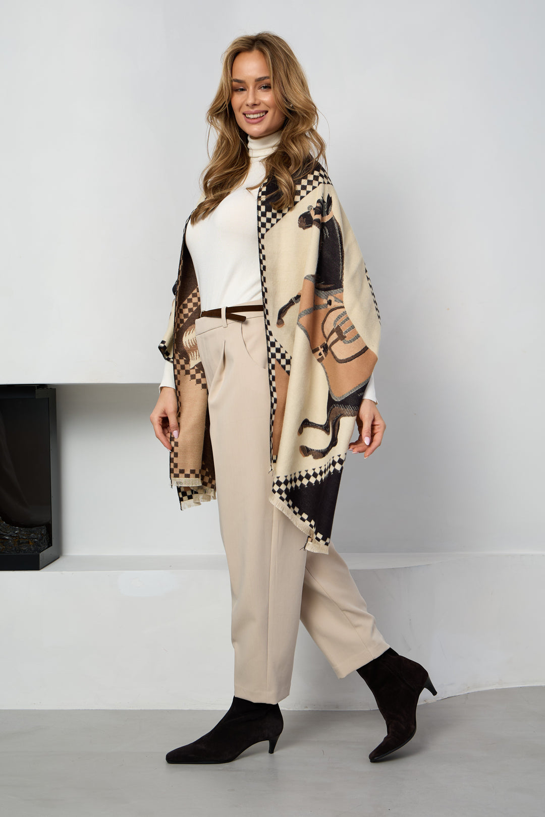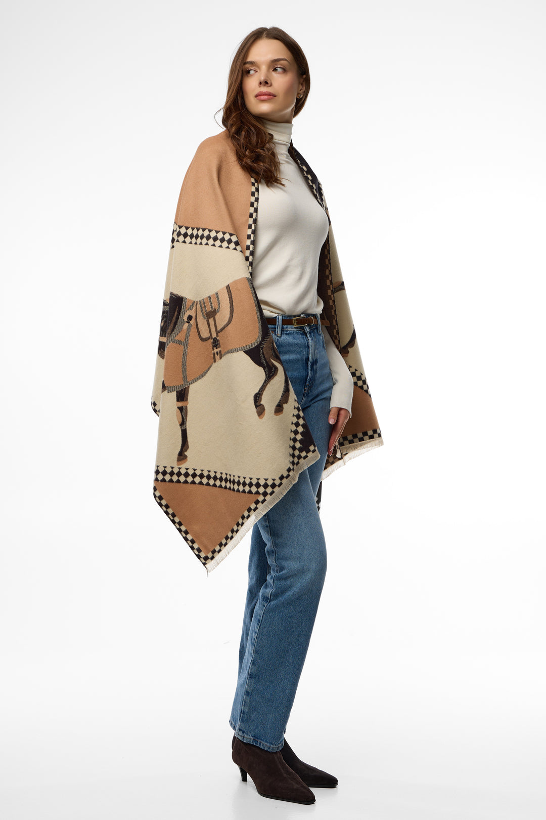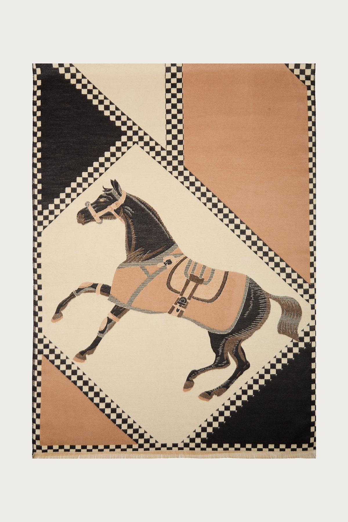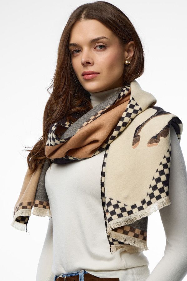 The Checkered Equestrian Reversible Scarf is a Western chic statement piece, blending a classic heritage pattern with a bold, graphic print. The generous, oversized wrap features elegant horse motifs framed by a striking black and white checkerboard pattern, offering versatile style on both sides. Drape this shawl over your shoulders with a simple, long-sleeved dress, or knot it around the neck of a tailored coat for a sophisticated, high-impact accessory.