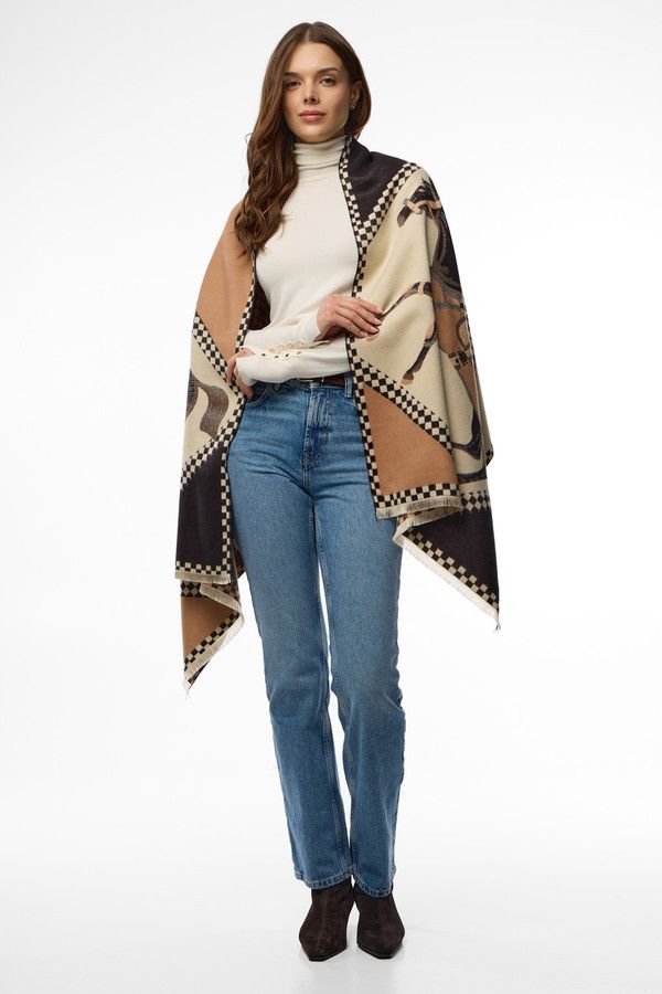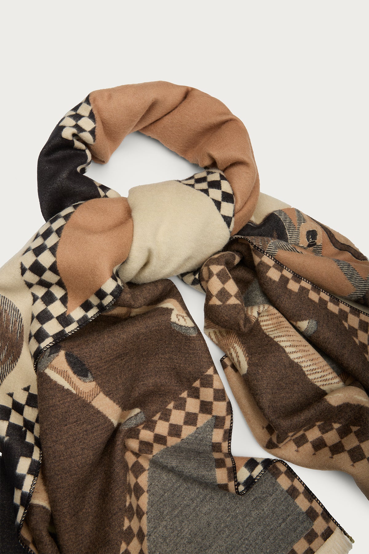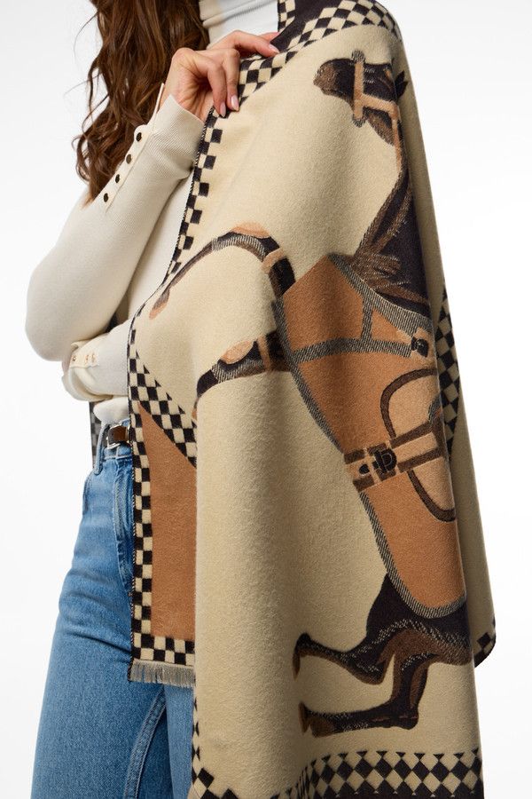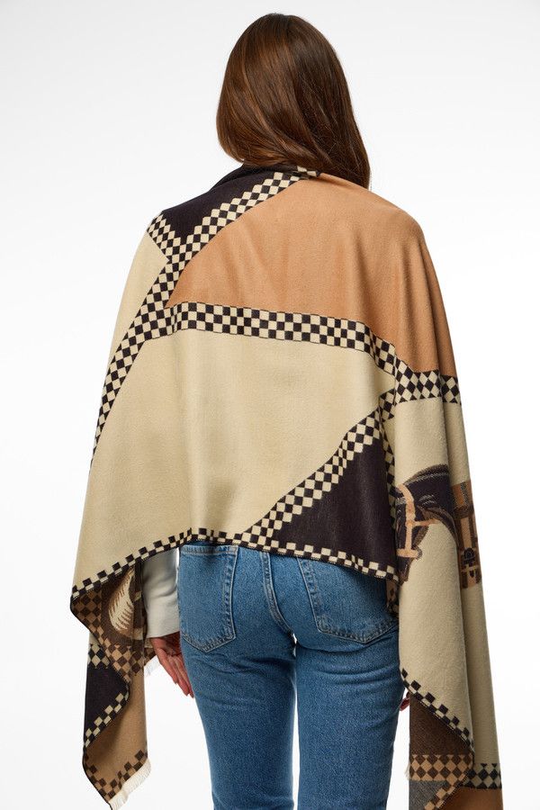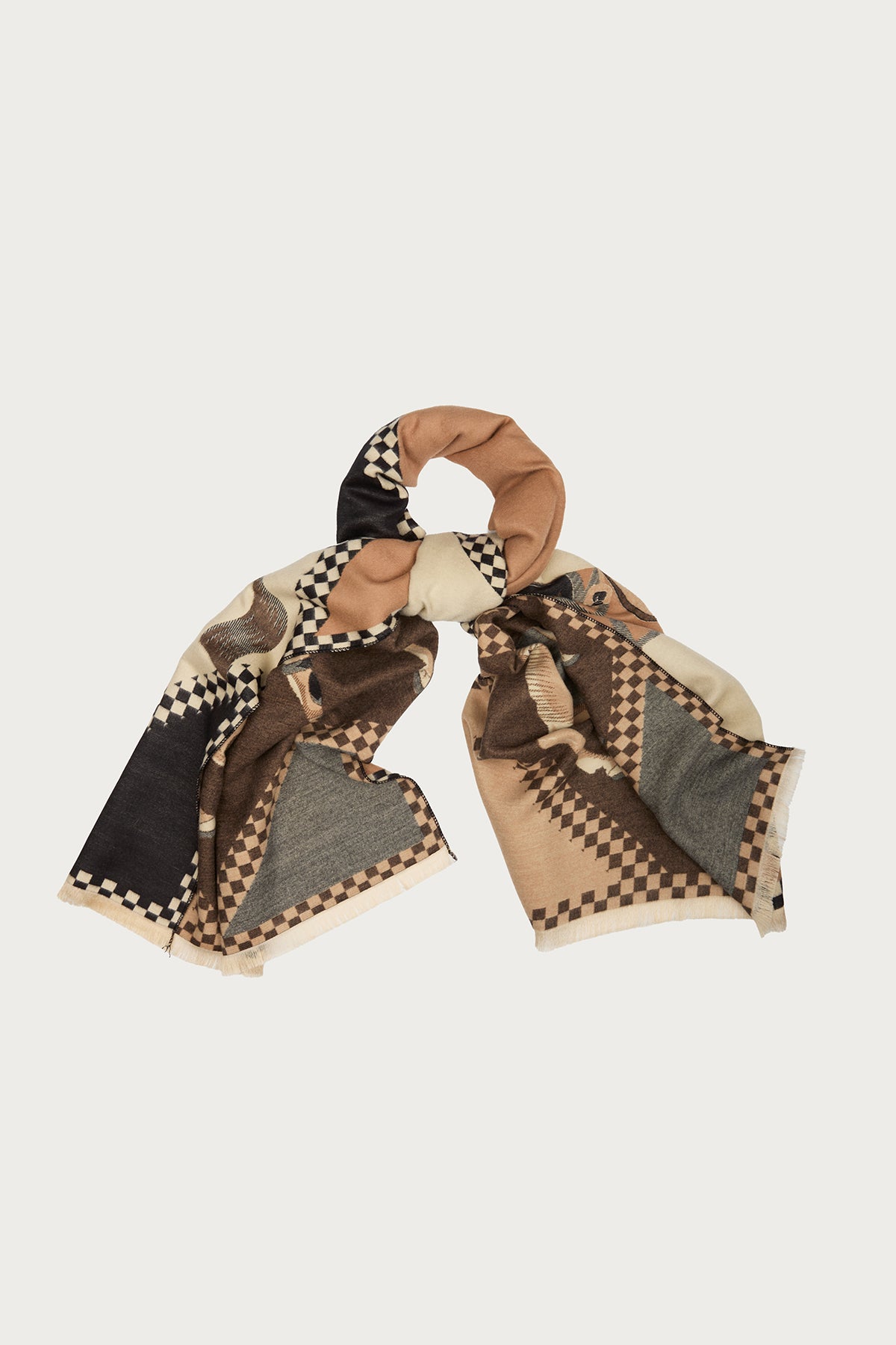 The Checkered Equestrian Reversible Scarf is a Western chic statement piece, blending a classic heritage pattern with a bold, graphic print. The generous, oversized wrap features elegant horse motifs framed by a striking black and white checkerboard pattern, offering versatile style on both sides. Drape this shawl over your shoulders with a simple, long-sleeved dress, or knot it around the neck of a tailored coat for a sophisticated, high-impact accessory.