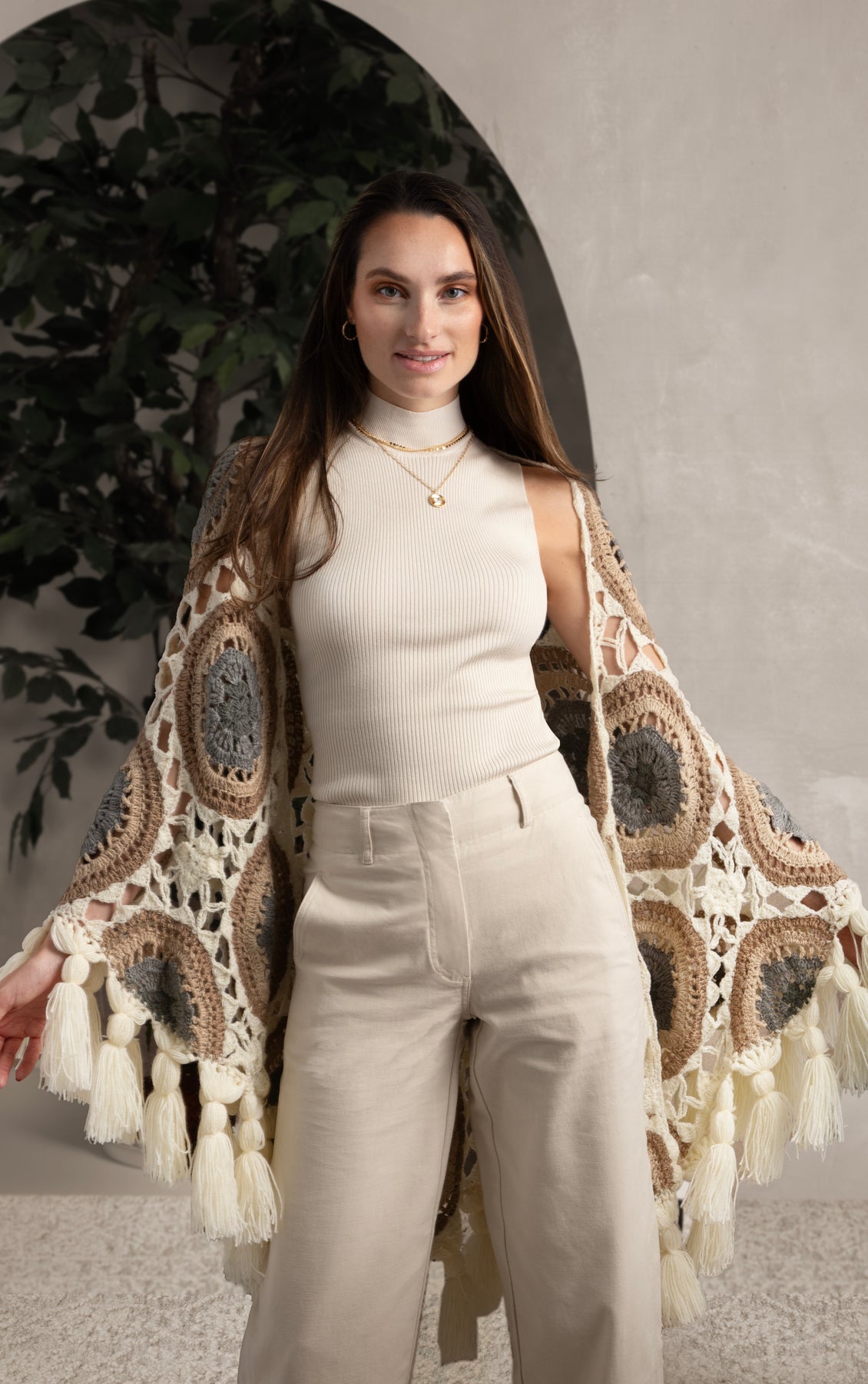 Looking for a stylish accessory that can keep you cozy on chilly days? Look no further than our Crocheted Sunshine Shawl! This beautiful shawl, made with comfortable materials, displays a stunning crocheted sun design, adding a touch of warmth and sunshine to any outfit. With its intricate crochet pattern and large tassels at the bottom, this shawl is truly unique and stands out from other accessories in your collection. Plus, it's versatile enough to wear to any occasion, whether running errands, attending a party, or simply lounging at home. Don't miss out on adding this must-have piece to your wardrobe!