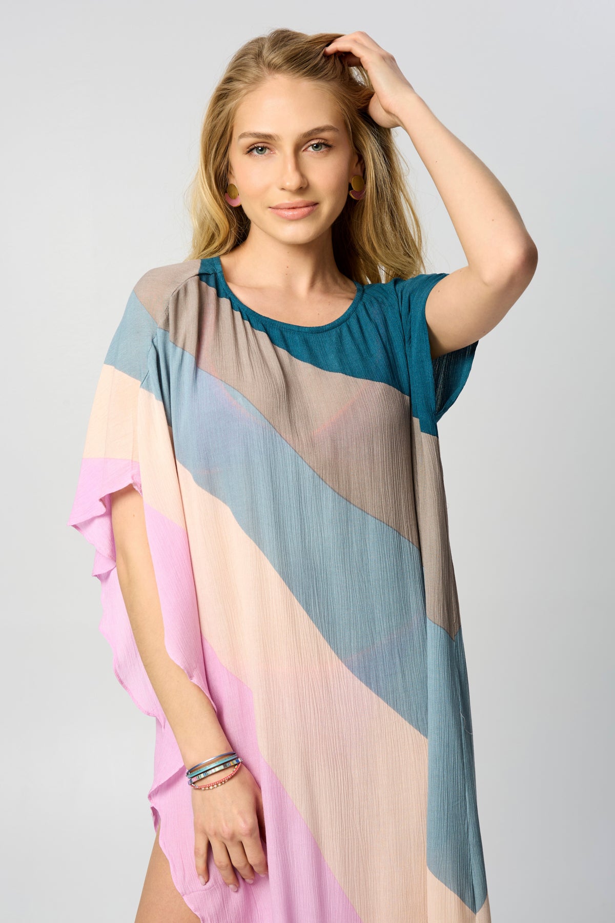 Introducing our Kaftan Striped Maxi, a summer breeze in bold stripes. This flowy dress offers a relaxed silhouette in breathable fabric with a mix of muted and vibrant large diagonal stripes. Perfect for effortless day-to-night summer style.