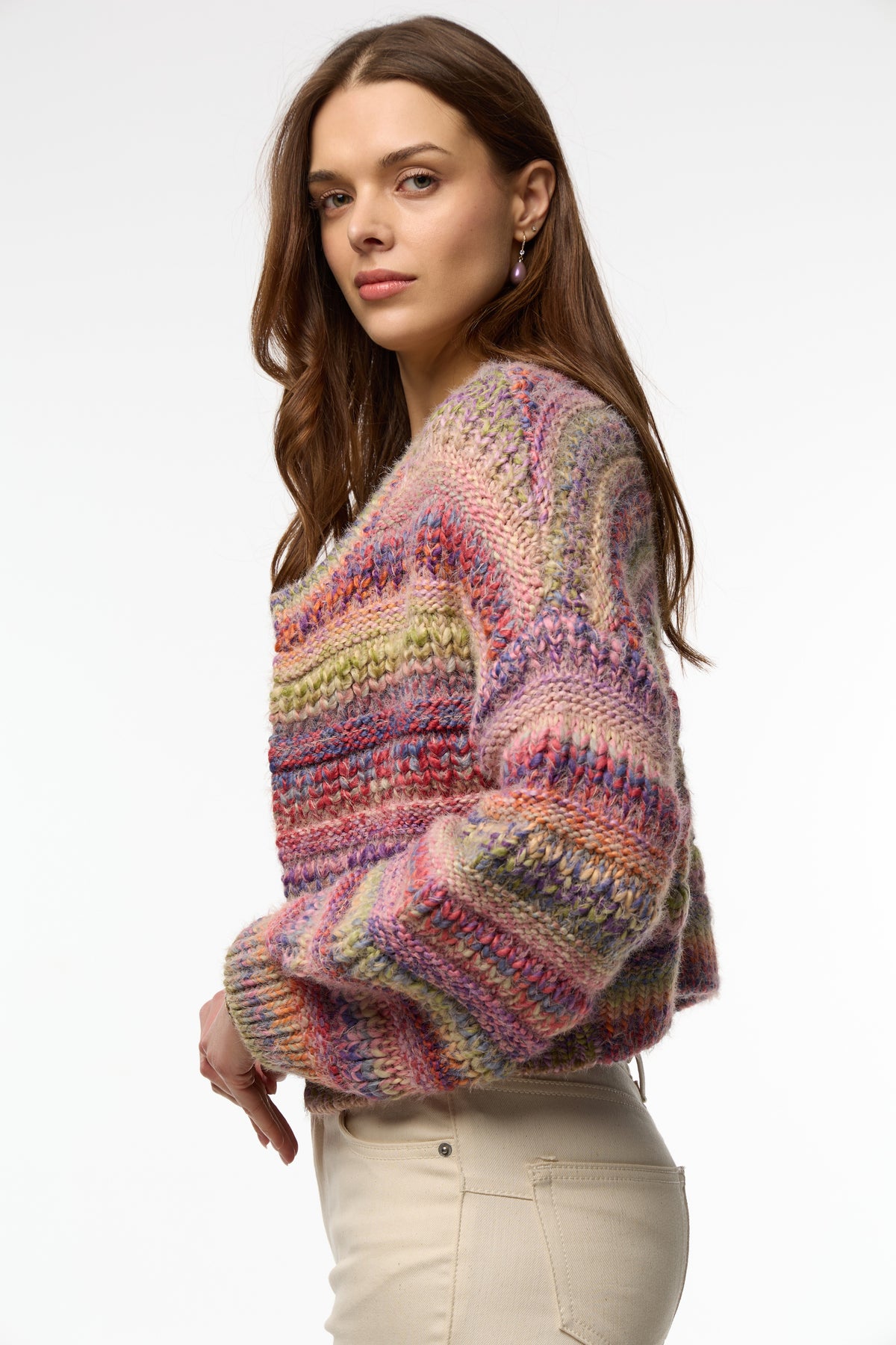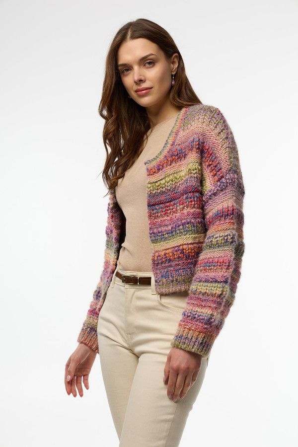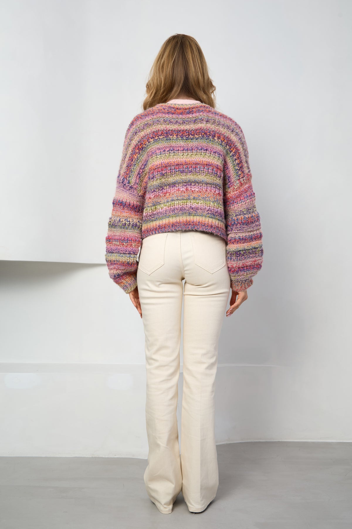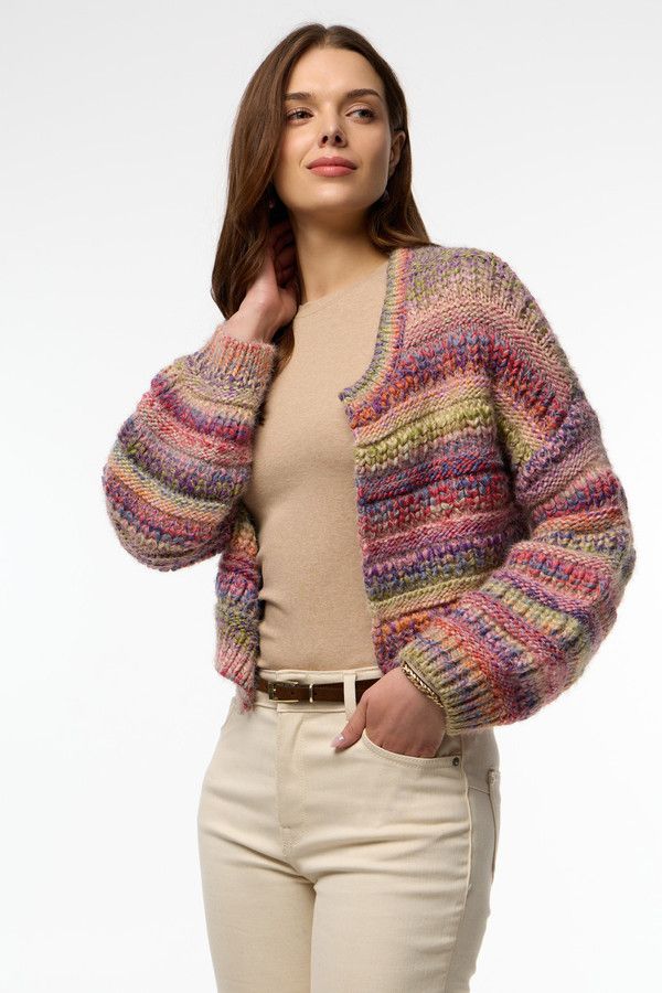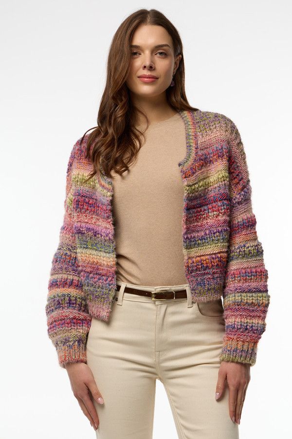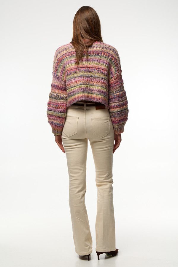 The Multicolored Crop Knit Cardigan is a vibrant burst of color, crafted from a chunky, fuzzy knit featuring an eye-catching mix of playful rainbow hues. This cozy, cropped silhouette features a classic crewneck and voluminous sleeves, making it a perfect high-impact layering piece. Wear this statement piece with simple, high-waisted denim to let the vibrant texture and color be the focal point of your outfit.