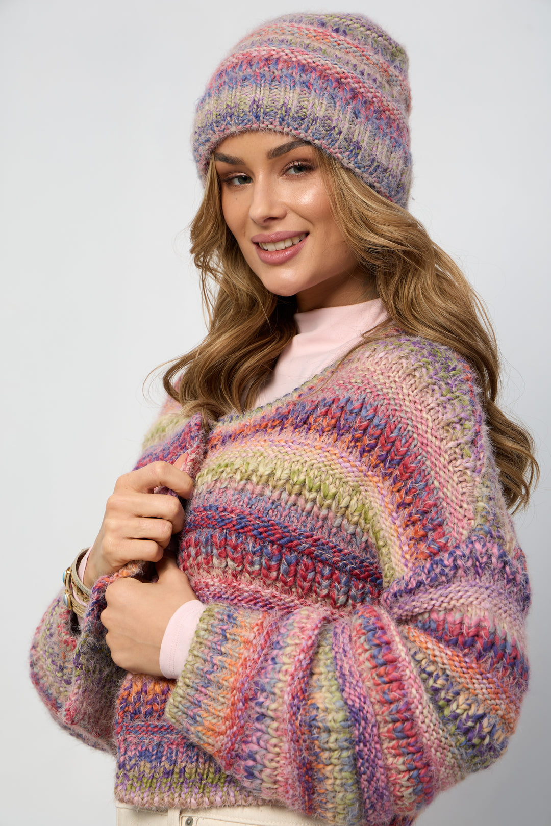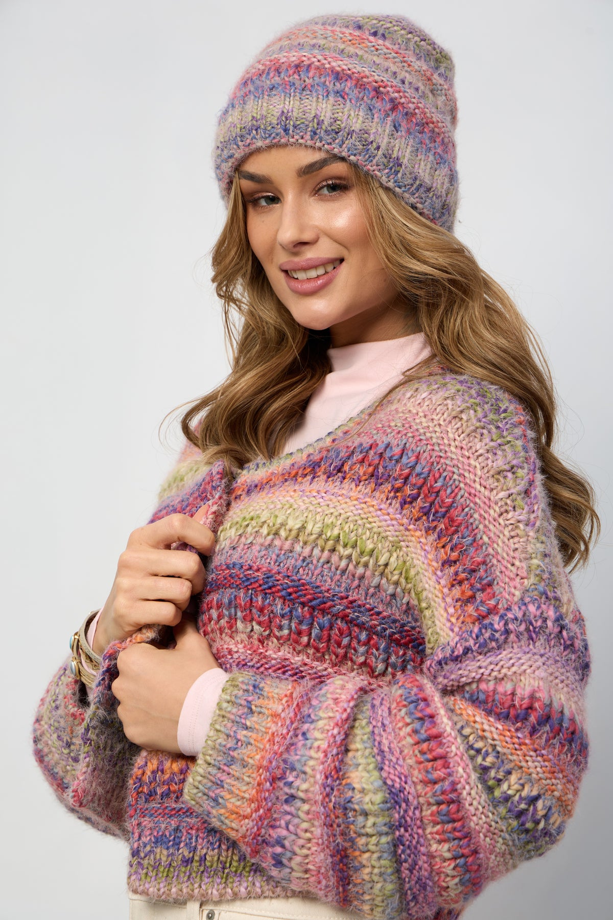 Keep warm this season with our Multicolored Knit Beanie. Crafted from soft, cozy knit fabric, this beanie features a beautiful gradient of red, orange, pink, green, blue, and purple hues. The fading design adds a touch of sophistication while still providing a vibrant pop of color. Pair it with our matching Multicolored Knit Scarf for a complete look. Perfect for chilly days in the city or any occasion where you need extra warmth and style.