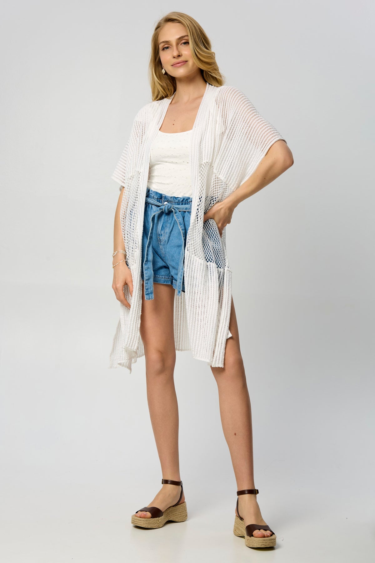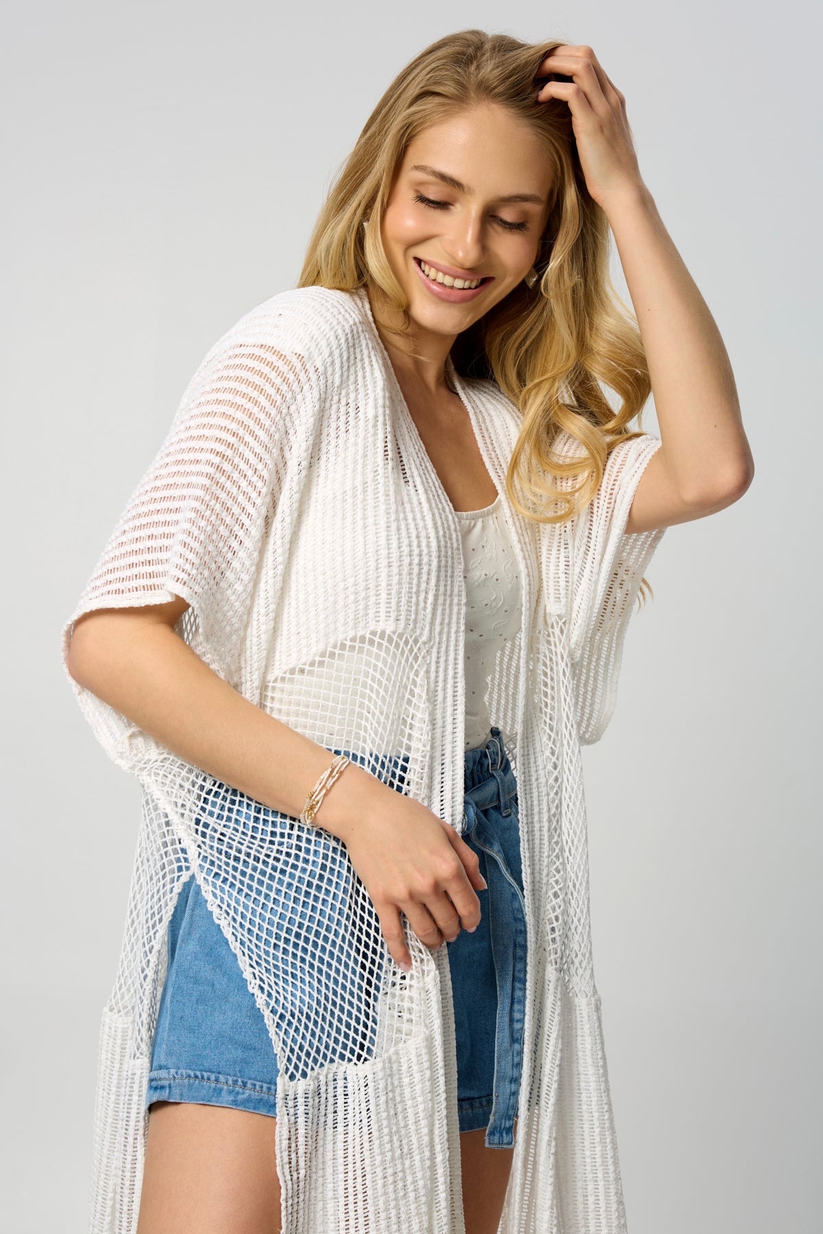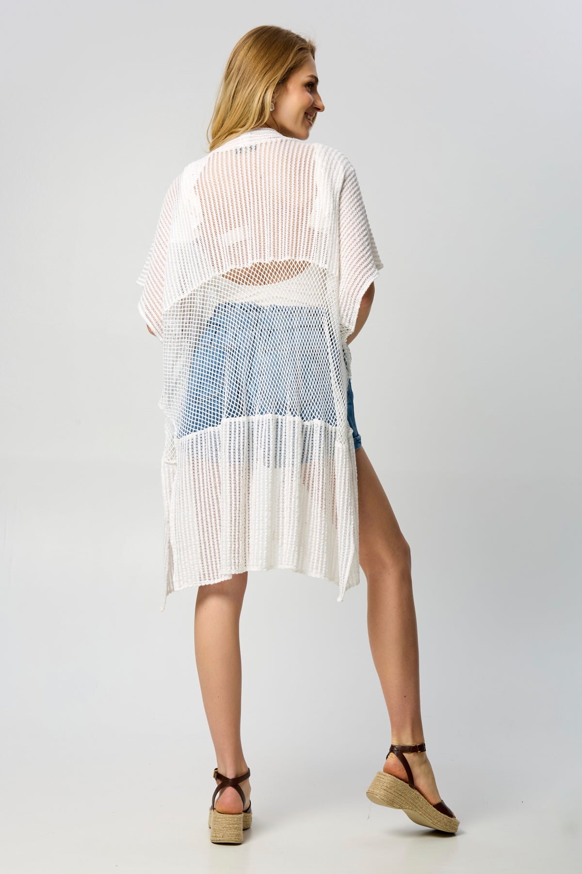 Elevate your style with our Open-Knit Cover-Up, featuring mixed media detailing for a chic, contemporary look. The intricate open-knit design adds texture and dimension, making it versatile for both casual and sophisticated occasions. Lightweight and breathable, it's perfect for layering over swimwear or pairing with a sundress.