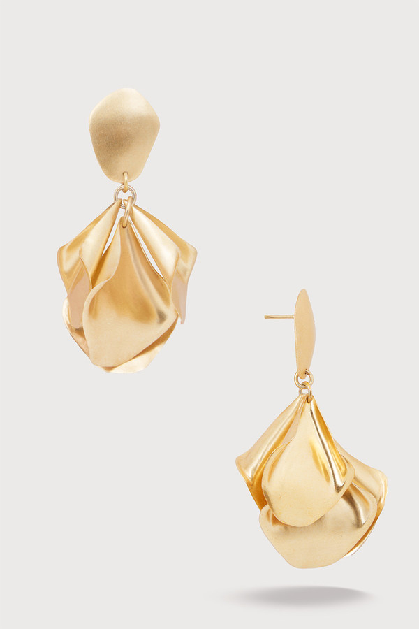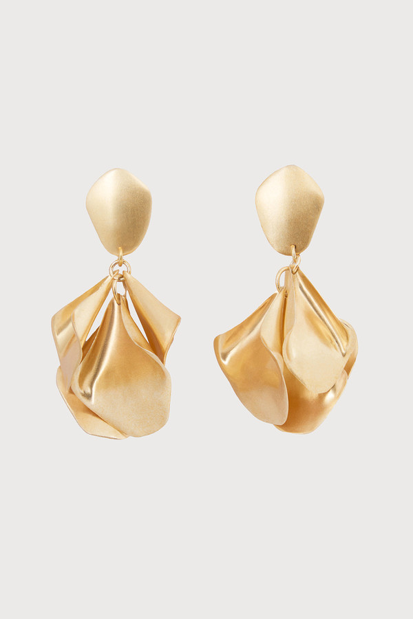 Our Petal to the Metal Earrings showcase golden metal petals suspended from a sleek gold-plated geometric post. These earrings offer a unique blend of elegance and modern design with their shimmering golden tones. Wear them to add a sophisticated floral accent to a casual daytime look or complete a glamorous evening ensemble.