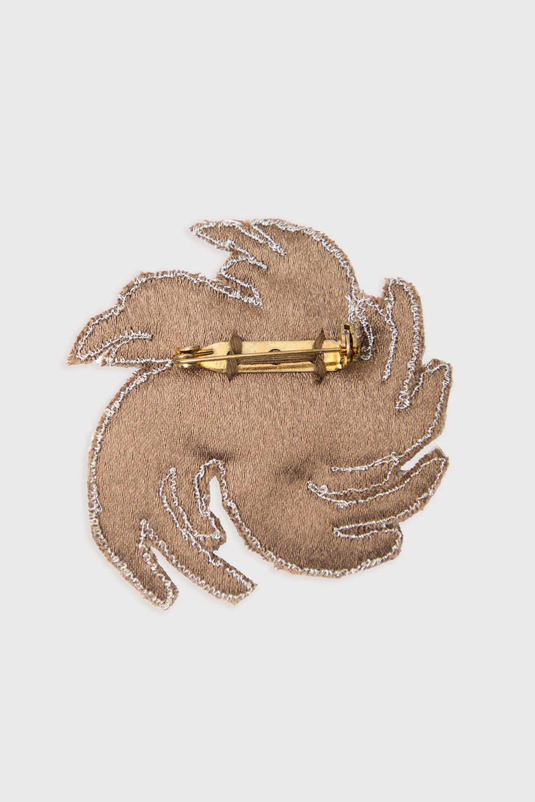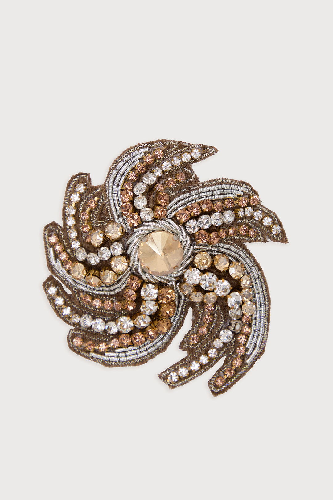 Swirl Around Burst Brooch is a radiant statement pin featuring a swirling starburst design with shimmering crystals and metallic bead embroidery in gold, champagne, and silver tones. A faceted center stone adds extra sparkle, making it the perfect accent for scarves, coats, blazers, or bags.